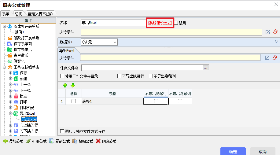 2、使用的导出Excel公式不是系统预设的,是自行添加至填表公式中的,那么该按钮也会显示出来