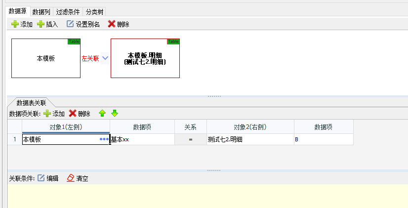 使用左关联,将基本信息数据项与明细信息数据项进行关联,关联条件为上一步在明细表中设计好的基本信息数据项与对应基本信息表中的数据项