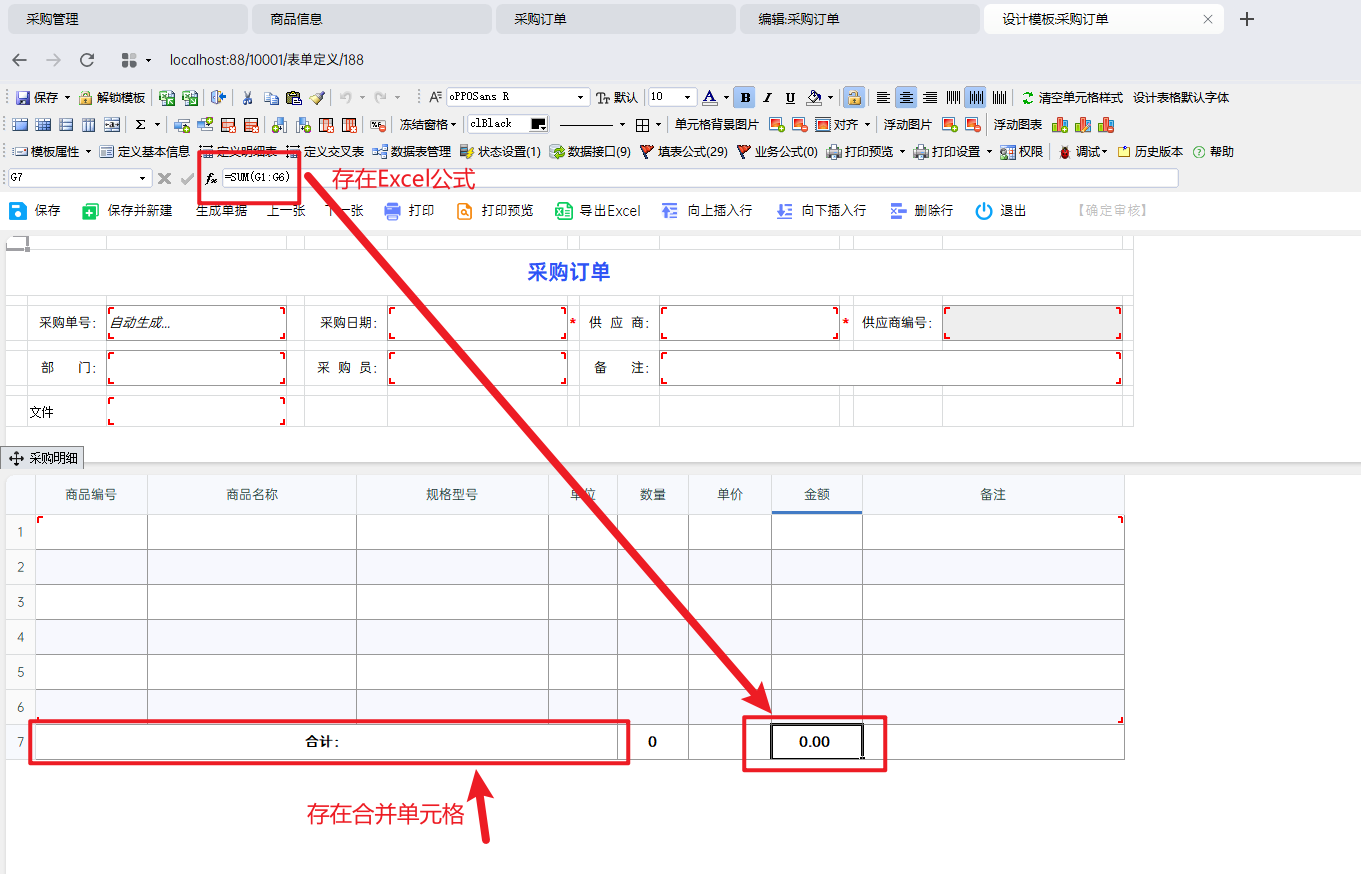 明细表下面有非明细表区域的表格、单元格有合并,明细表中存在excel公式,都会导致无法变更位置