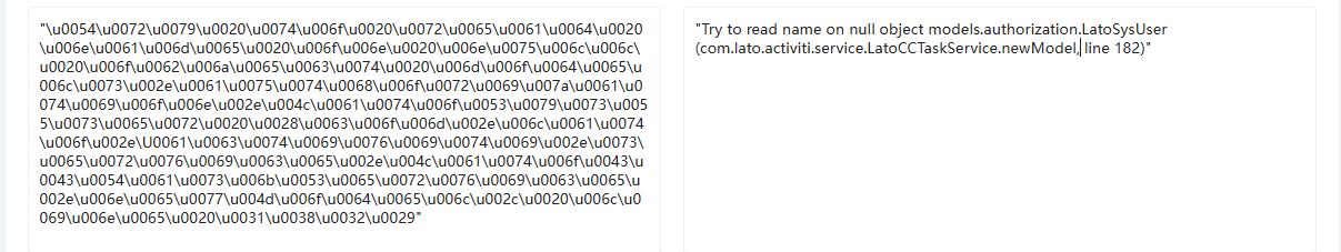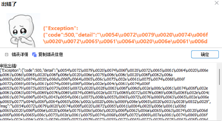 注意:该报错与其他报错不同,可以看到该报错为一串Unicode编码组成,需要对这一串编码进行转译,才能看到具体的报错信息,转译后的报错信息如下图:转译工具可以直接搜索,目前市面上有很多