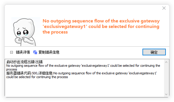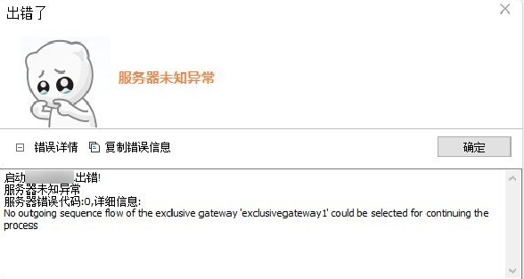 服务器错误代码:500,详细信息:No outgoing sequence flow of the exclusive gateway 'exclusivegateway1' could be selected for continuing the process