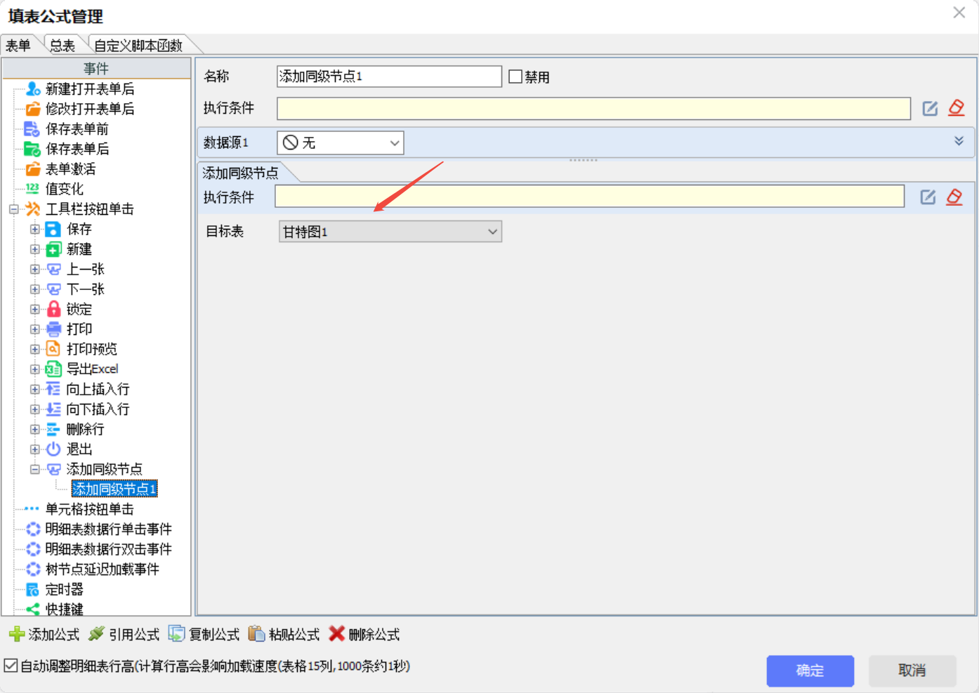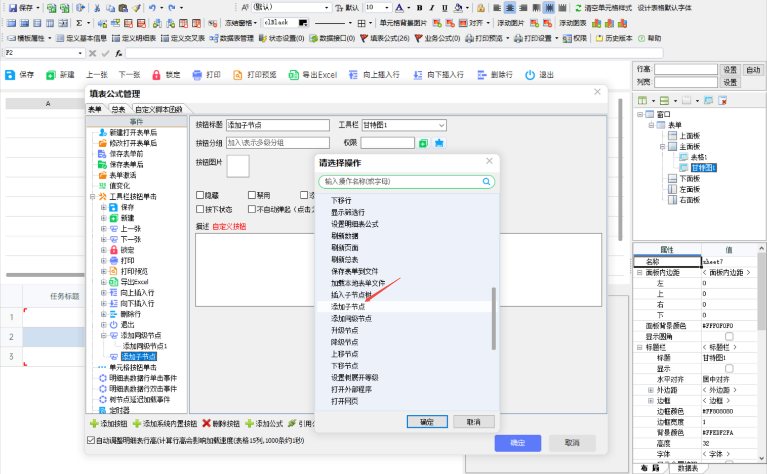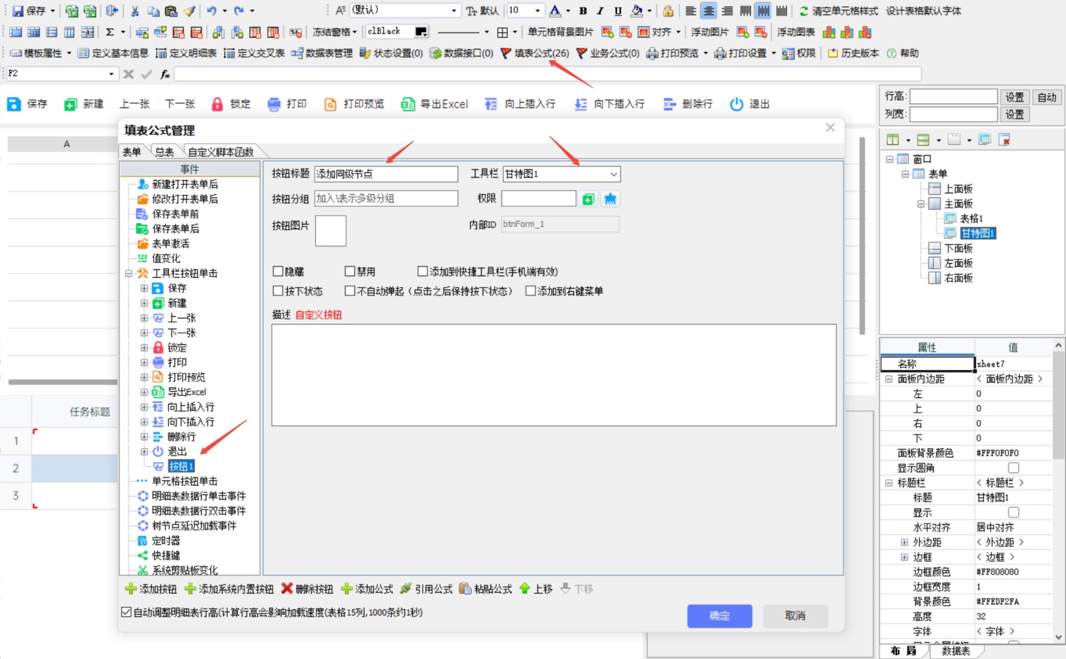 点击填表公式,添加一个工具栏按钮,名称设置为“添加同级节点”,工具栏处选择停靠在甘特图表格中。