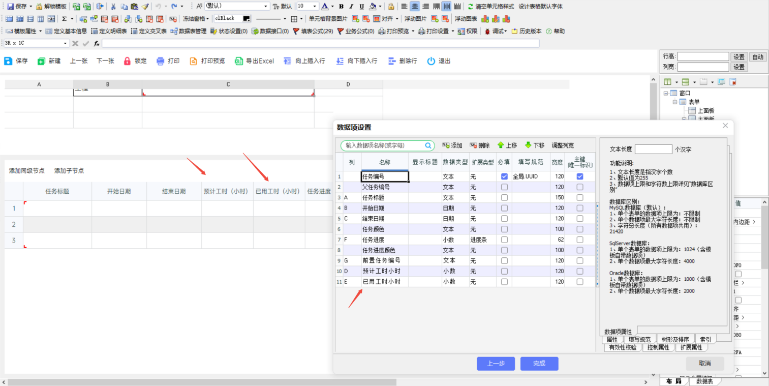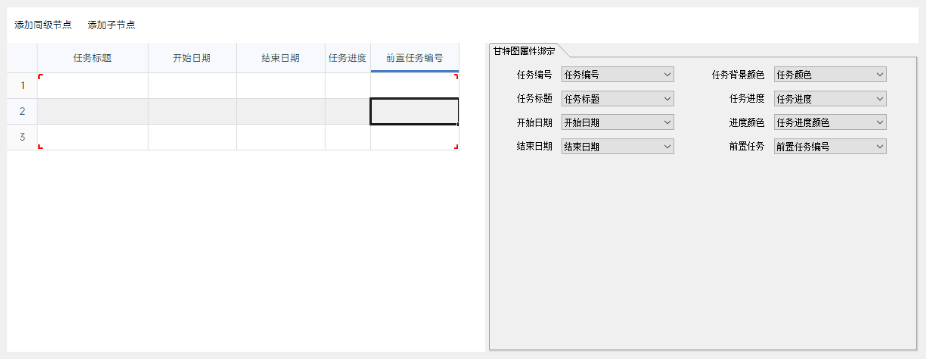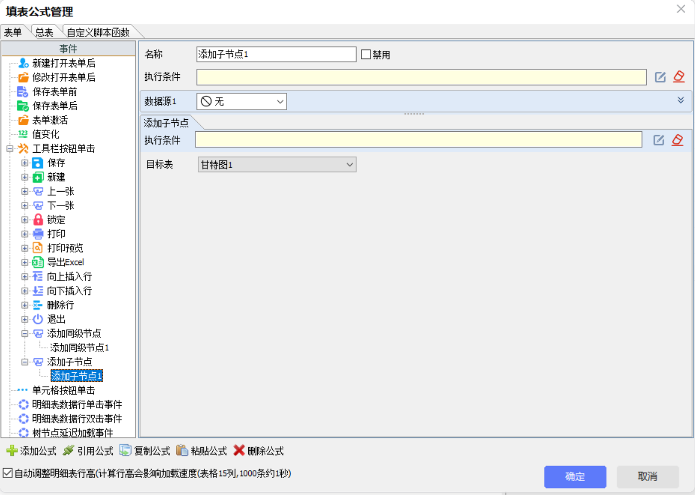 点击填表公式,添加一个工具栏按钮,名称设置为“添加同级节点”,工具栏处选择停靠在甘特图表格中。