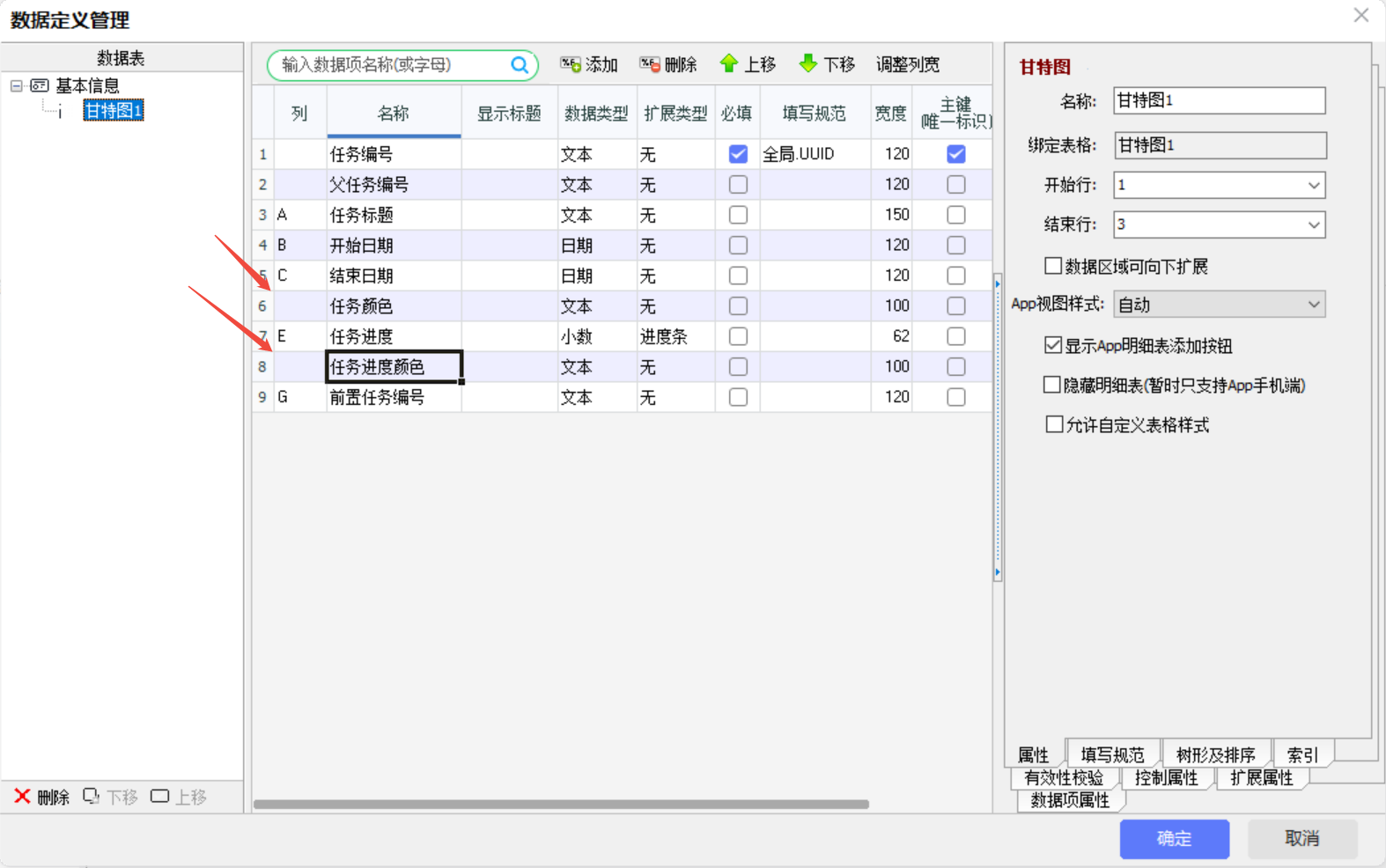 优化点1:隐藏任务颜色和任务进度颜色数据项。(通过设计期指定颜色,统一颜色,不允许运行期进行修改)。