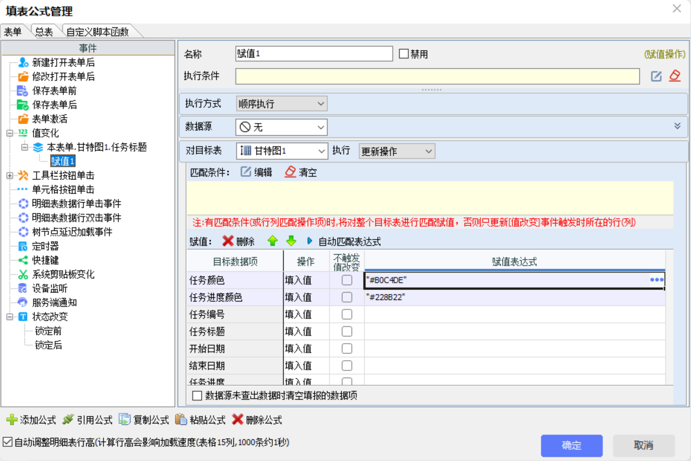 然后在任务标题值变化中加入赋值,对任务颜色和任务进度颜色这两个数据项进行赋值。