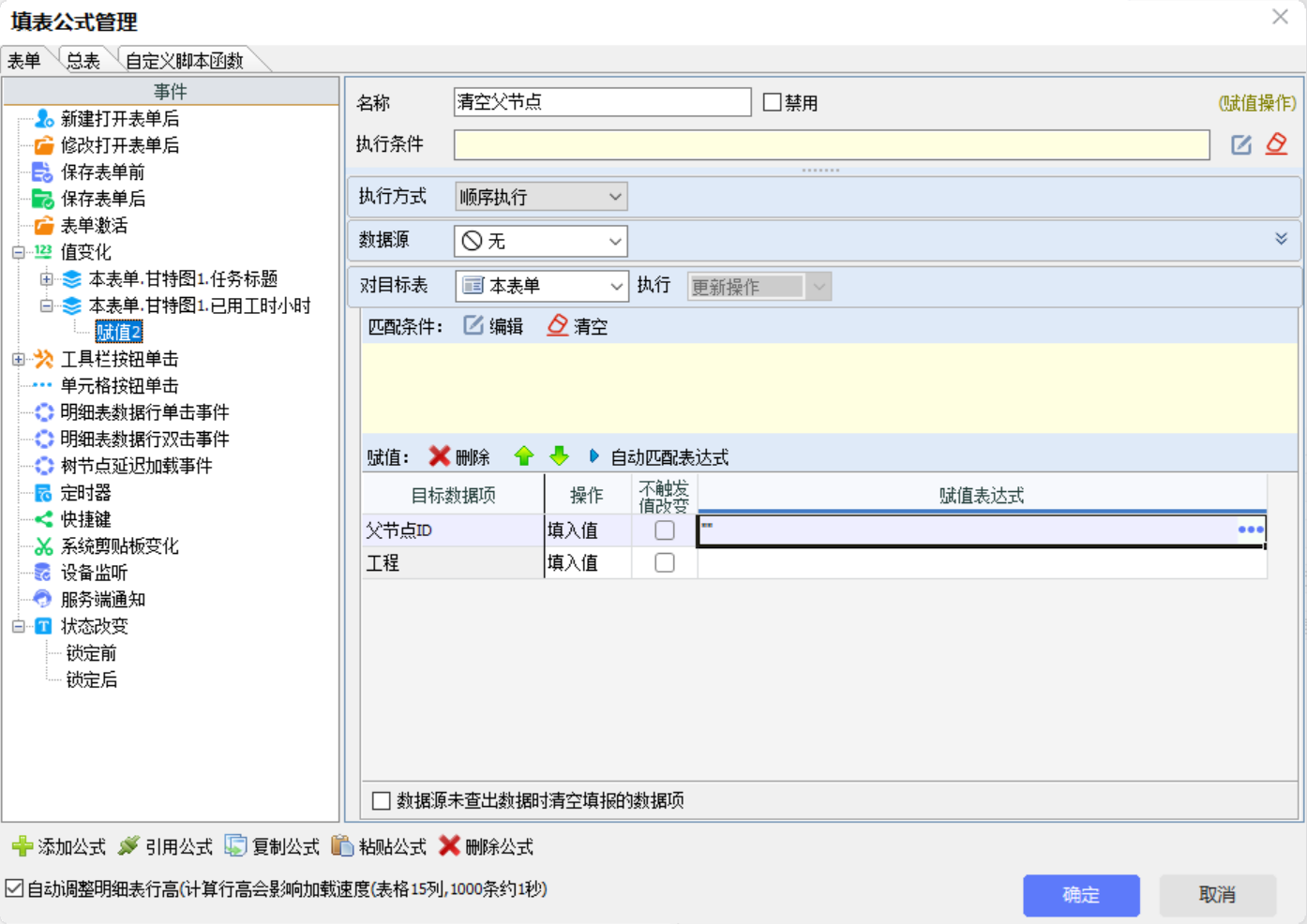 那么在值变化中,选择明细表的已用工时。然后添加赋值公式。第一个赋值公式先清空父节点。