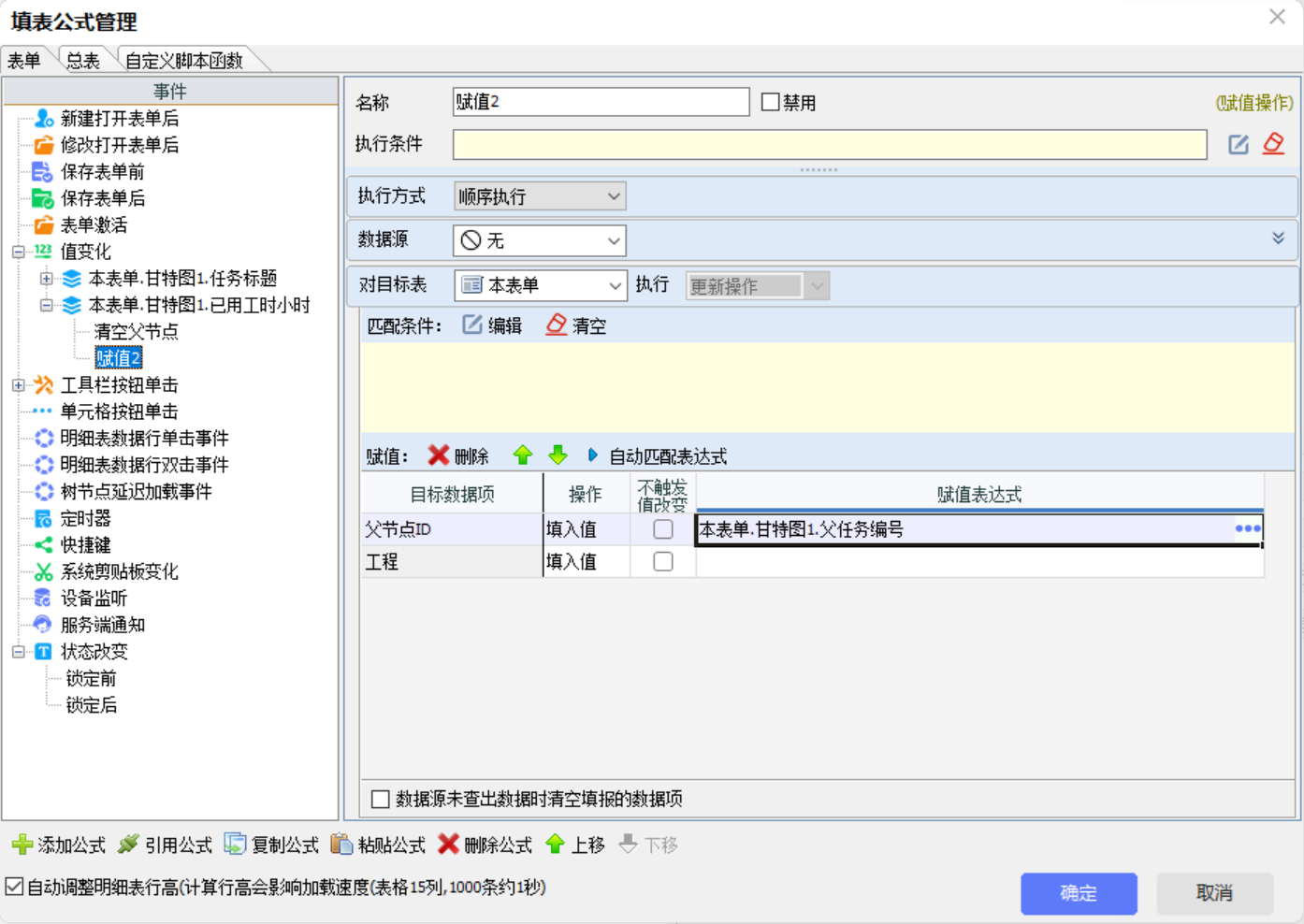第二个赋值公式对父节点ID进行赋值,赋值表达式为,当前这条任务的父节点编号。