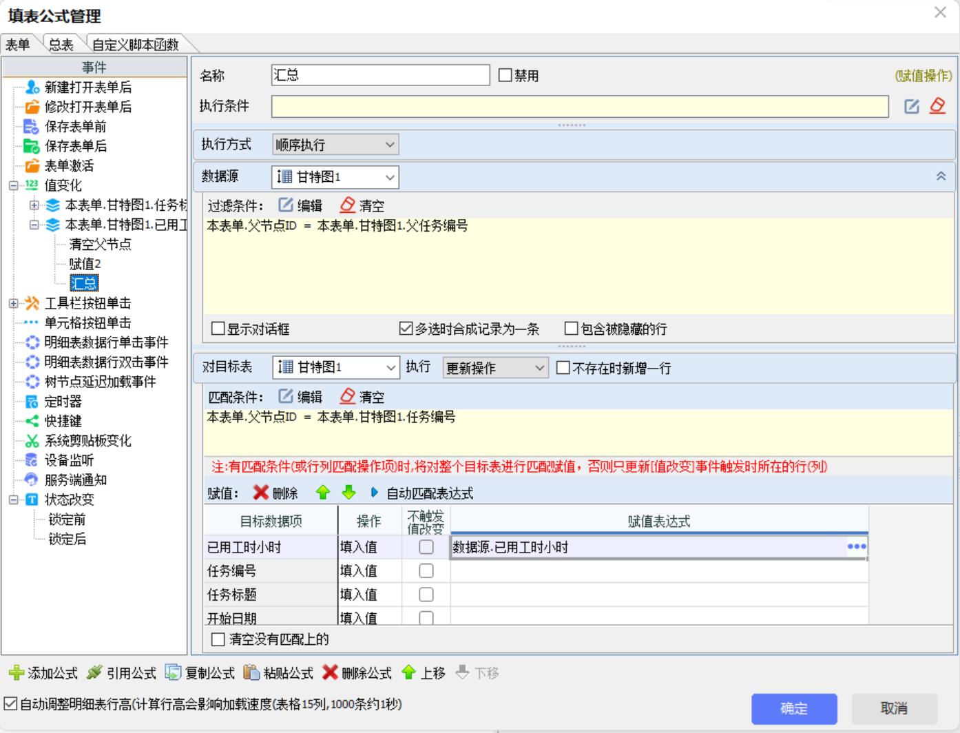 然后对目标表甘特图进行赋值,匹配条件为父节点ID = 任务编号。找到上面数据源数据的父任务,然后对父任务进行赋值。赋值表达式为数据源.已用工时。(数据源赋值时,如果勾选了多选时合成记录为一条,那么当数据源的数据项为小数/整数,且有多条数据时,会进行合计赋值)。