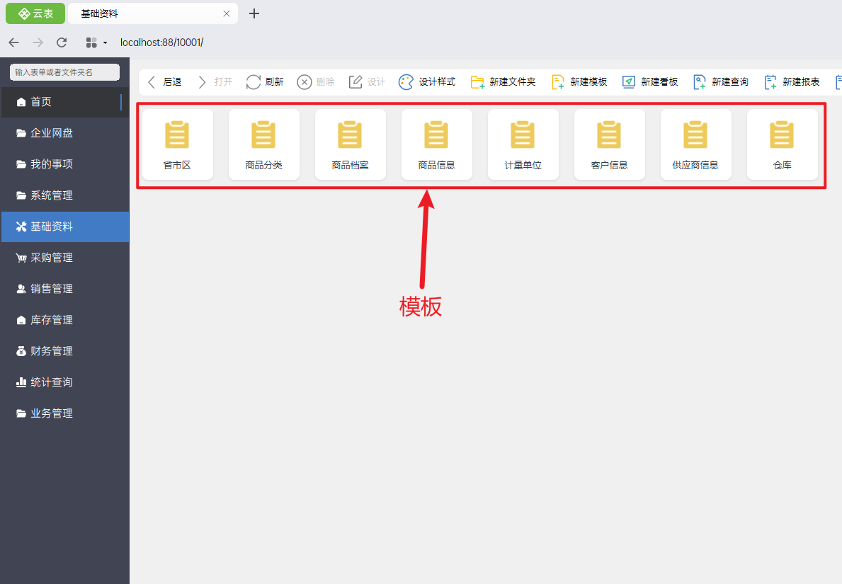 接下来,我们先以在文件夹“基础资料”中新建模板《商品档案》为例,一起来学习模板样式的设计。
