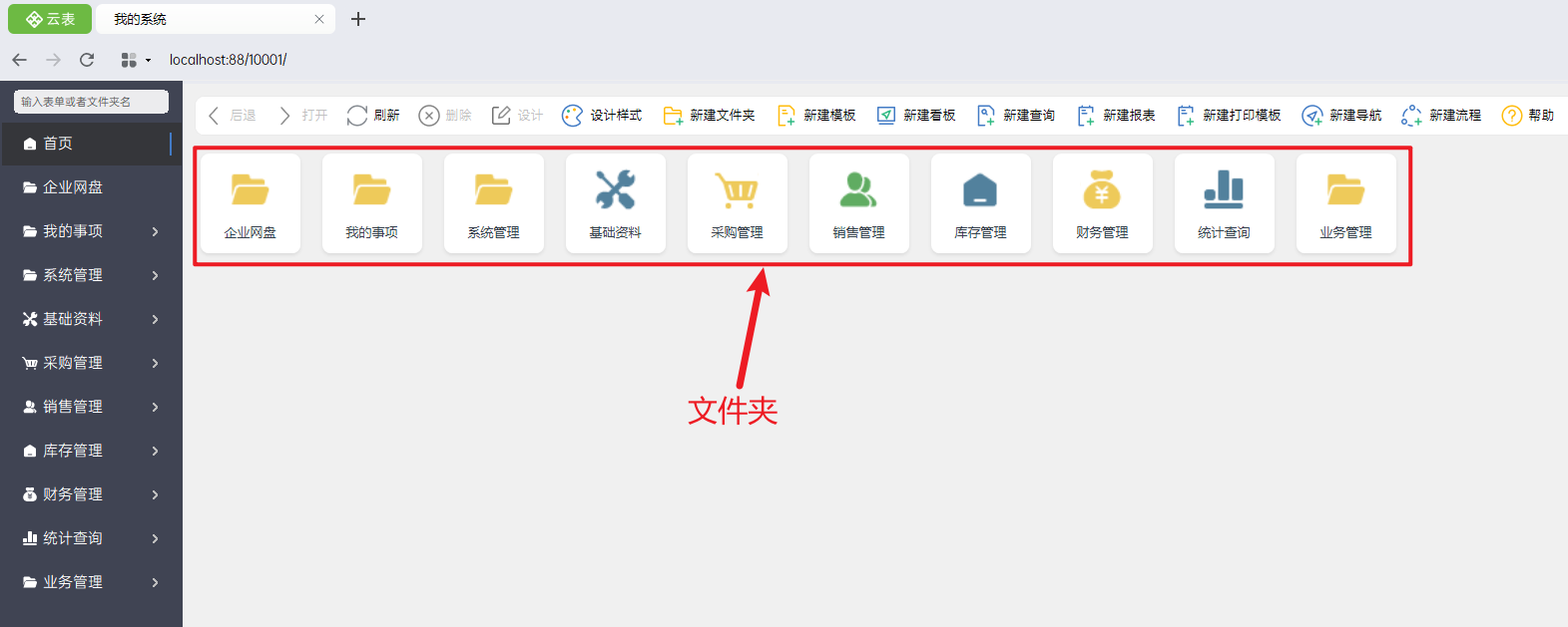 对应传统的管理软件,文件夹也可以作为功能模块来使用,例如:一般系统都有“基础资料”、“业务管理”、“统计报表”3个功能模块,在云表中,我们可以建立与此对应的3个文件夹来进行管理。