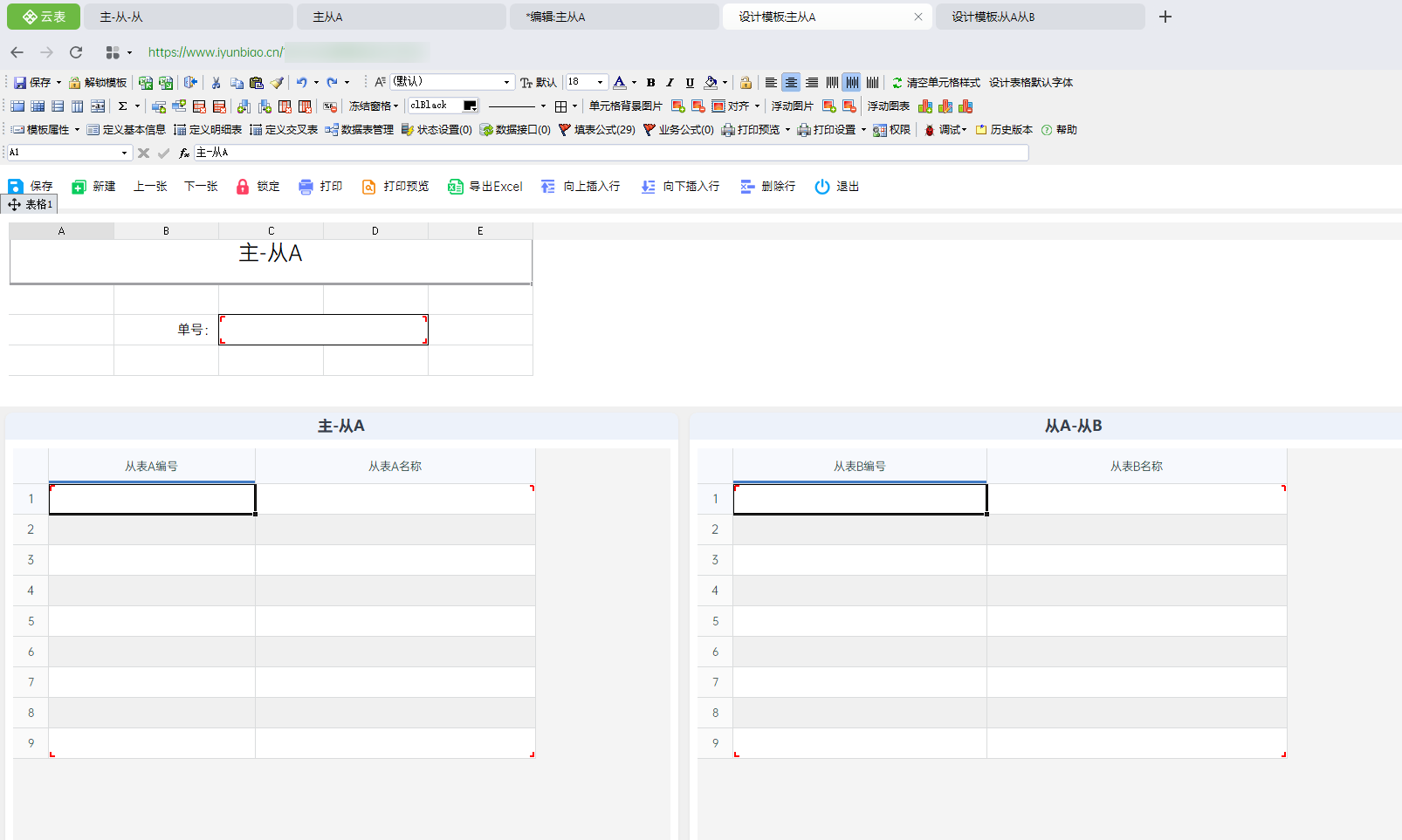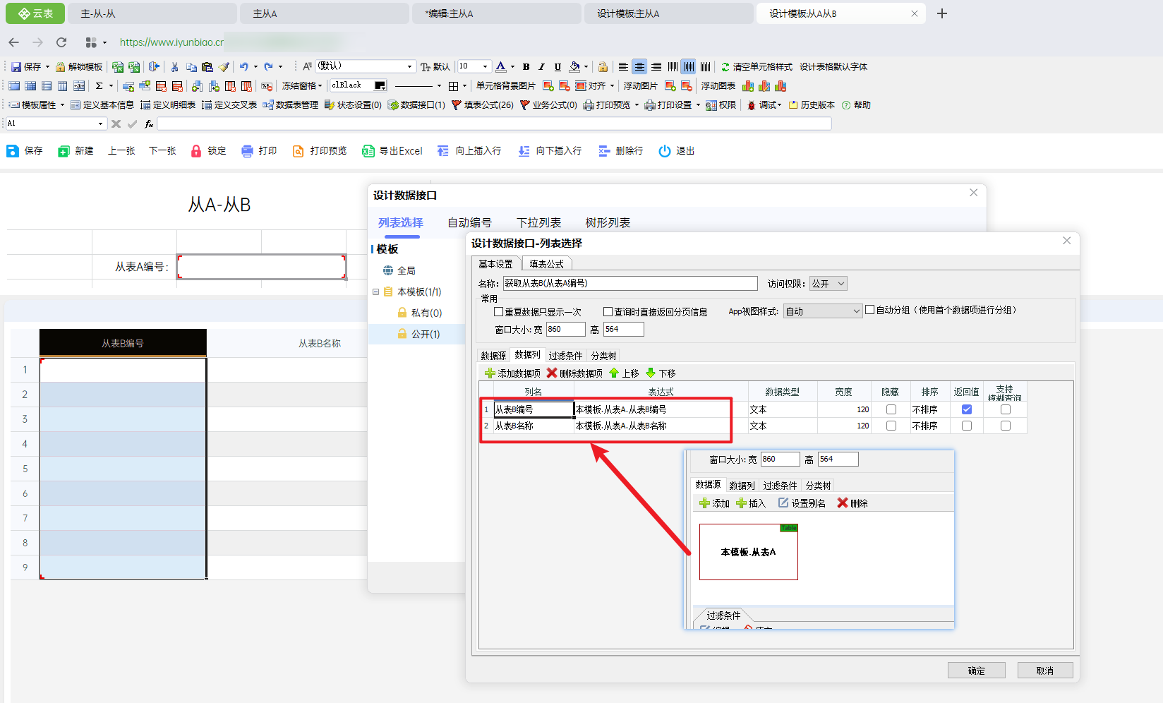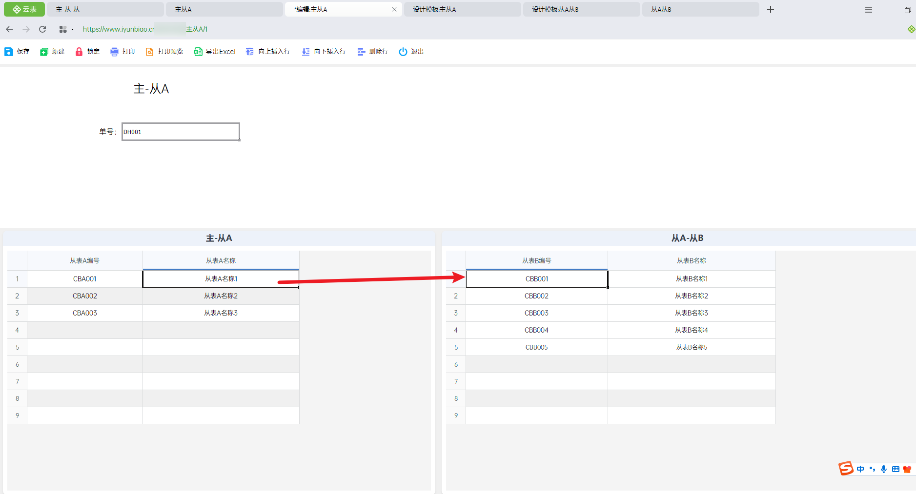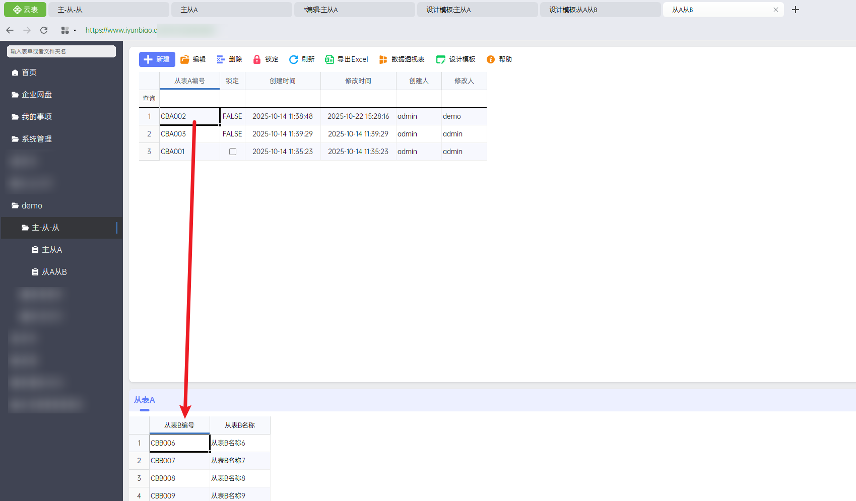 当表结构已经为主表-明细表时,需要设置明细表的从表,点击明细表的数据,即可在另一个明细表中看到该条明细的下级数据