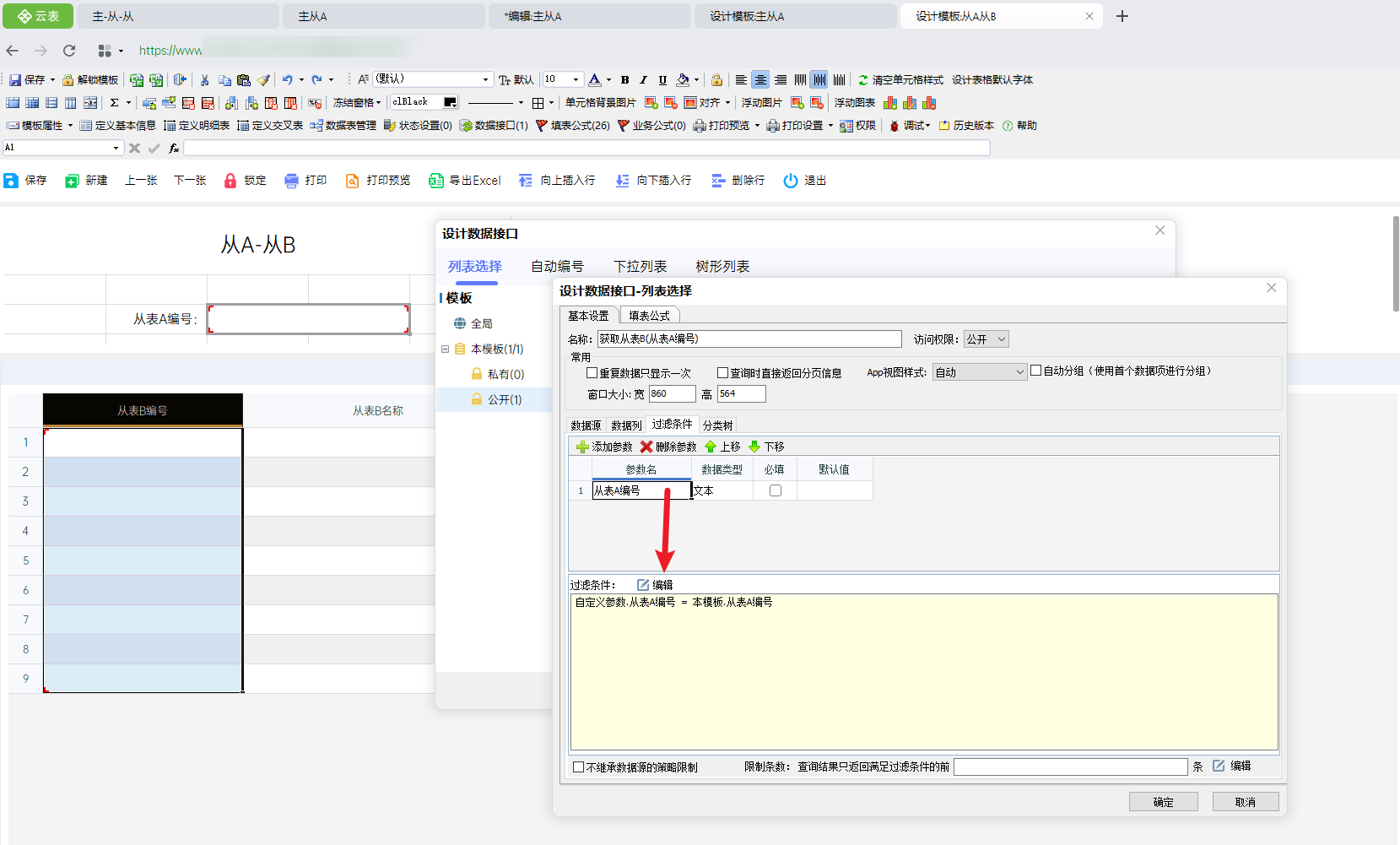 需要两个模板,一个模板用于存放从表A与从表B之间的关系,另一个模板展示主表-从表A-从表B之间的关系