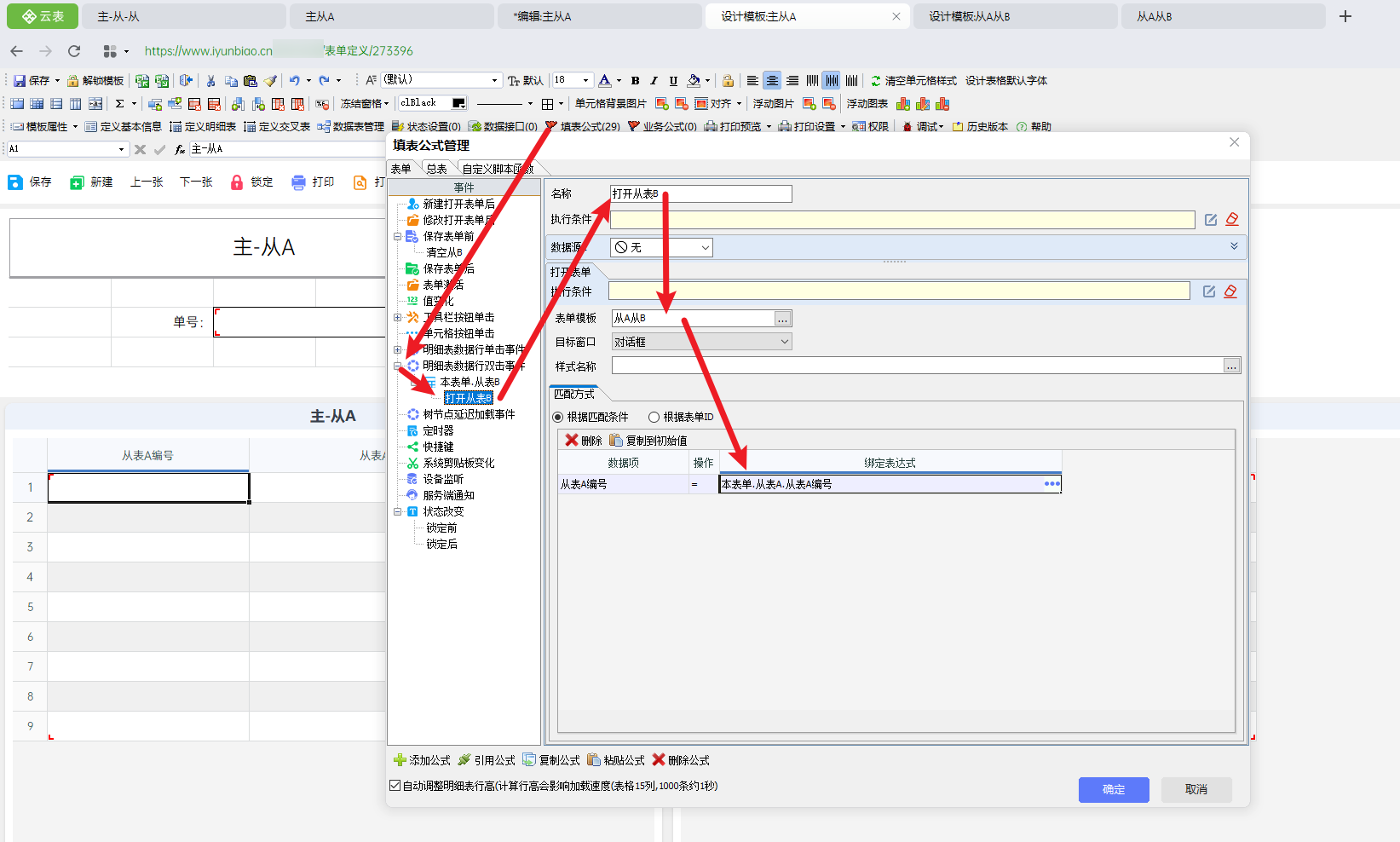 若需要双击从表B中的数据,达到打开从表A-从表B中表单的效果,则可以设计明细行双击事件,使用打开表单操作实现
