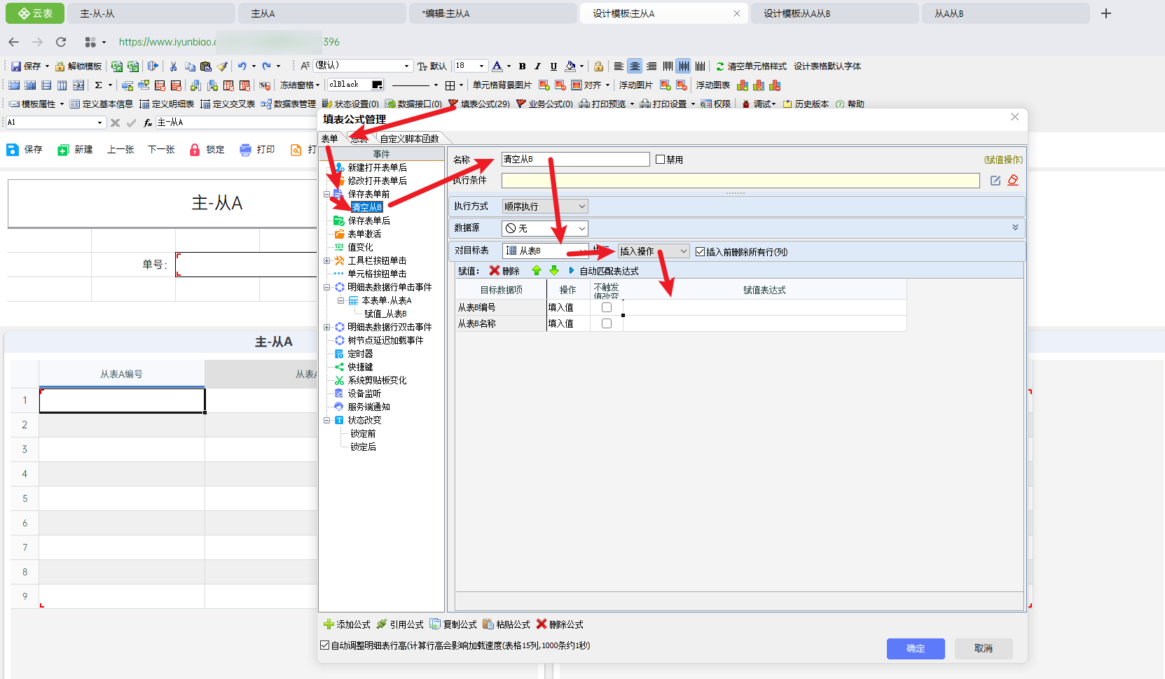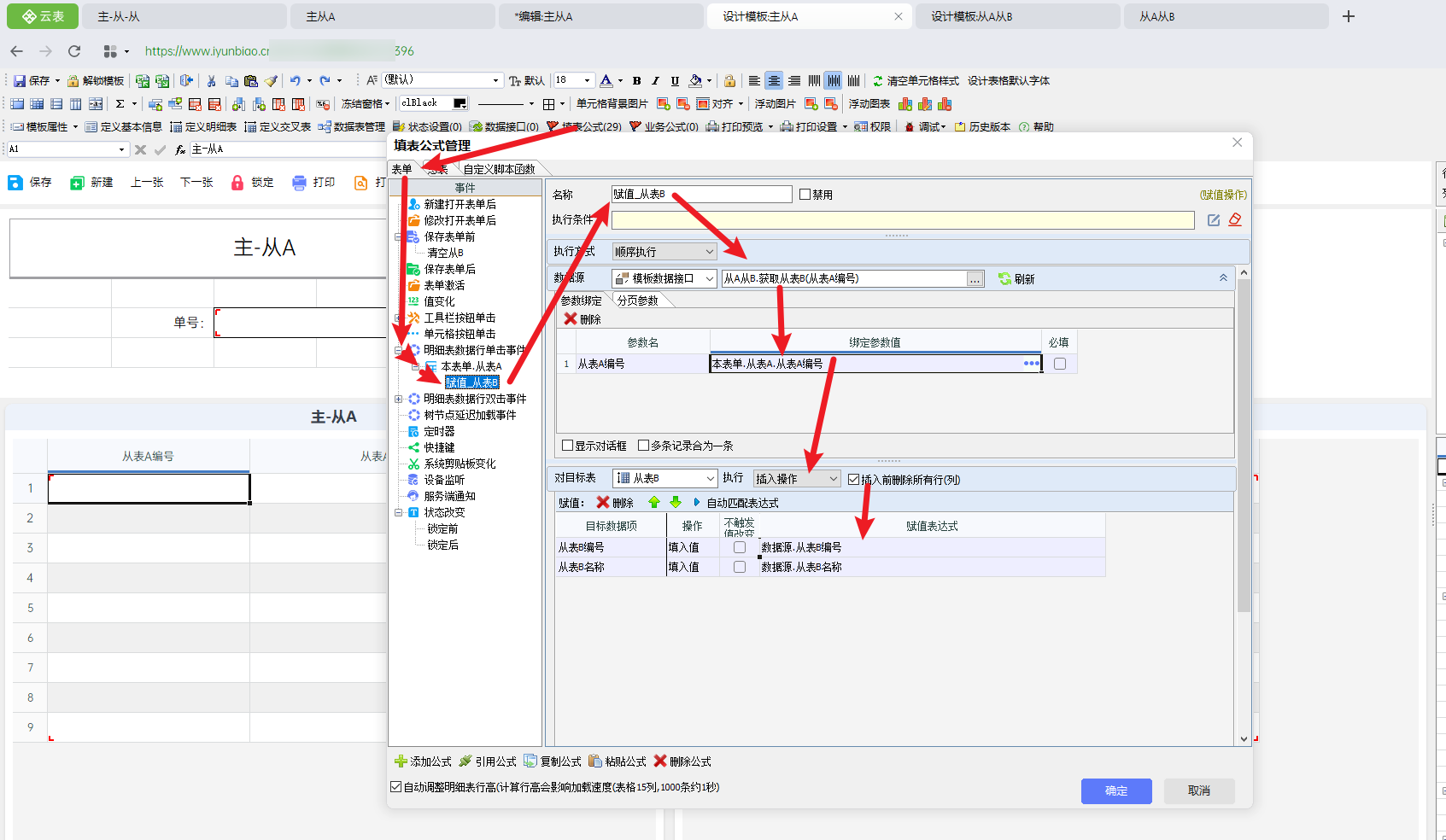 添加从表A的明细行单击事件,调用3.数据接口设计中设计的数据接口,绑定参数,选择插入操作,勾选插入时删除所有行列,并对从表C赋值