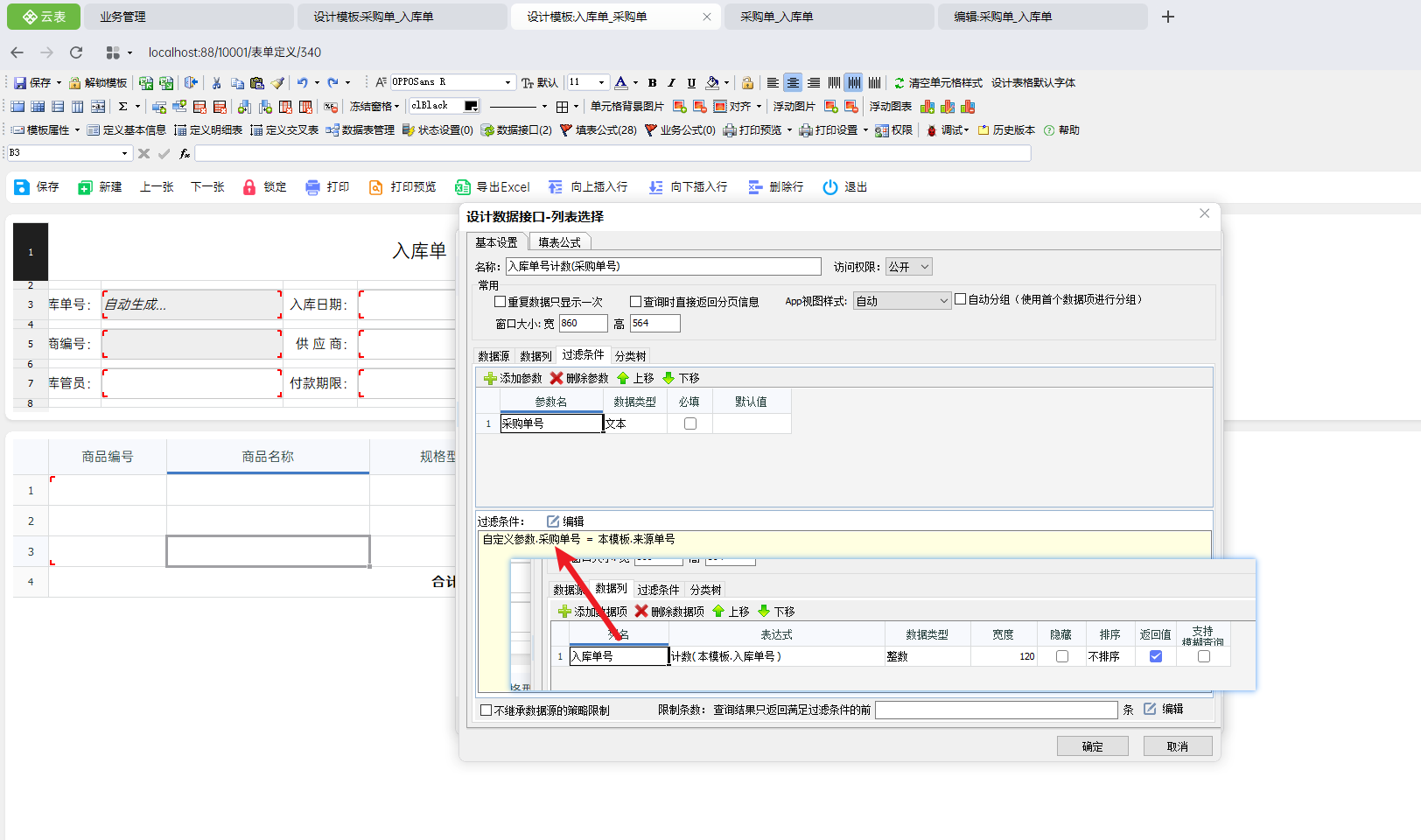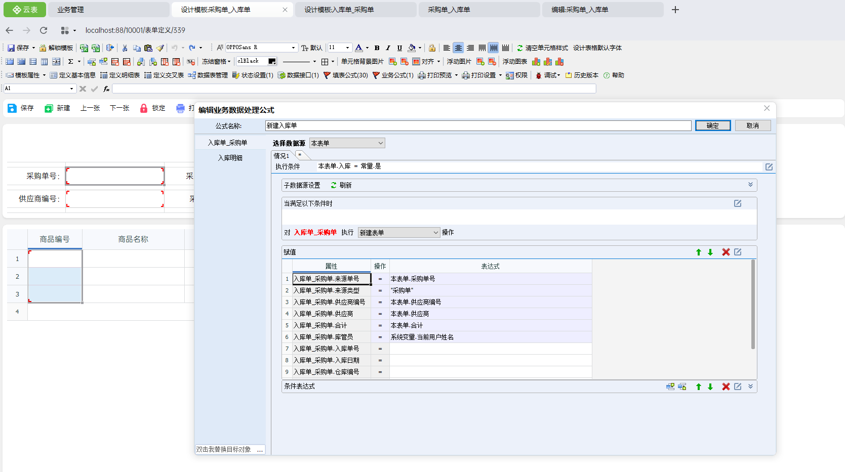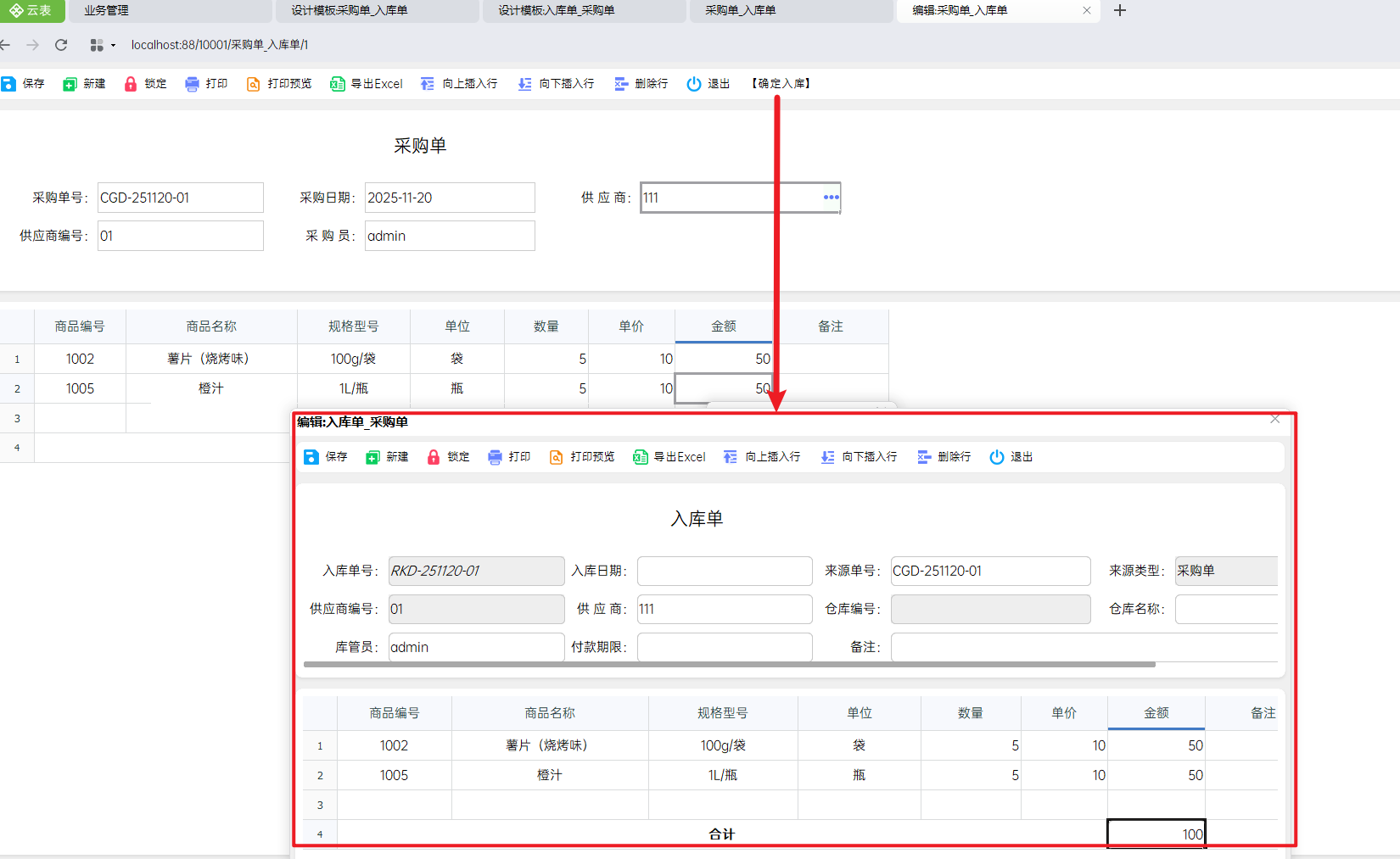 (2)使用的场景为采购单生成入库单后打开入库单,在实际使用过程中,可以按照自己的需求设计模板,本文档只说明操作方法