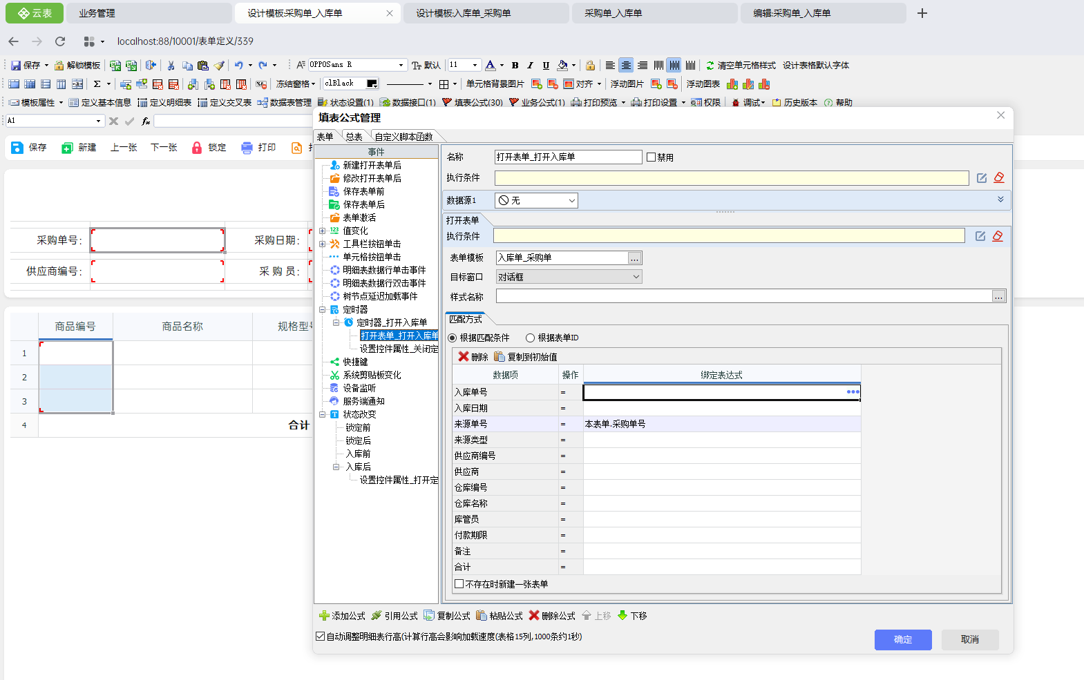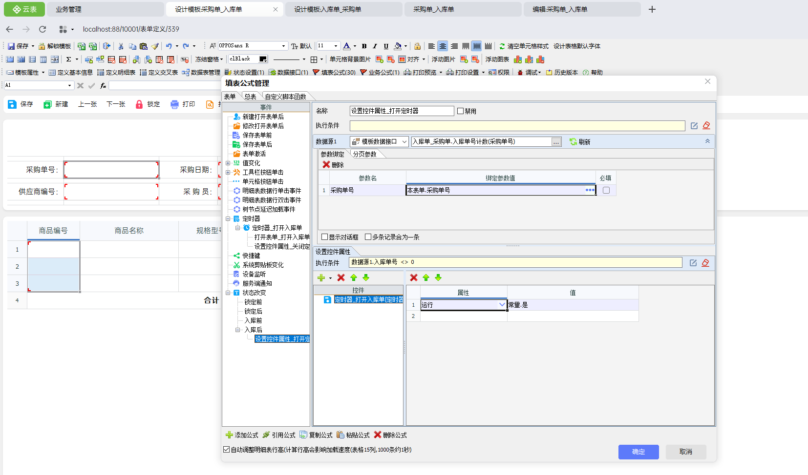 a.在填表公式中找到状态后(在这里为入库后)的事件,在事件下添加“设置控件属性”,打开定时器,调用②设计数据接口中,设计好的数据接口,填写执行条件为数据源.入库单号<>0,即有入库单时启动定时器