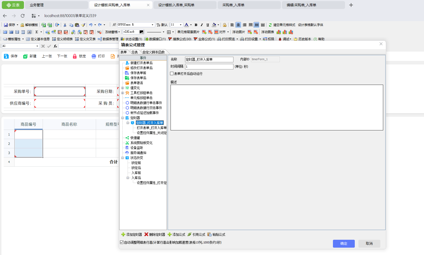 在“采购单”中添加定时器,设置运行间隔时间为1秒,取消勾选表单打开时运行