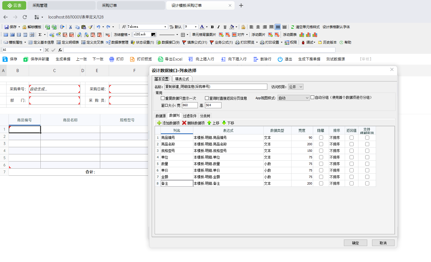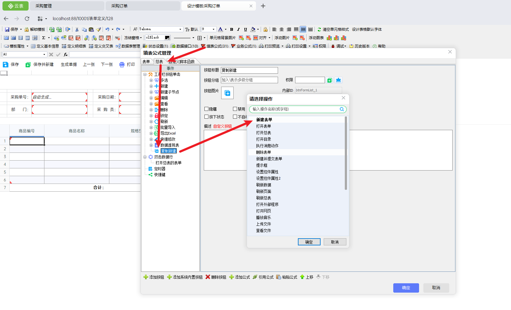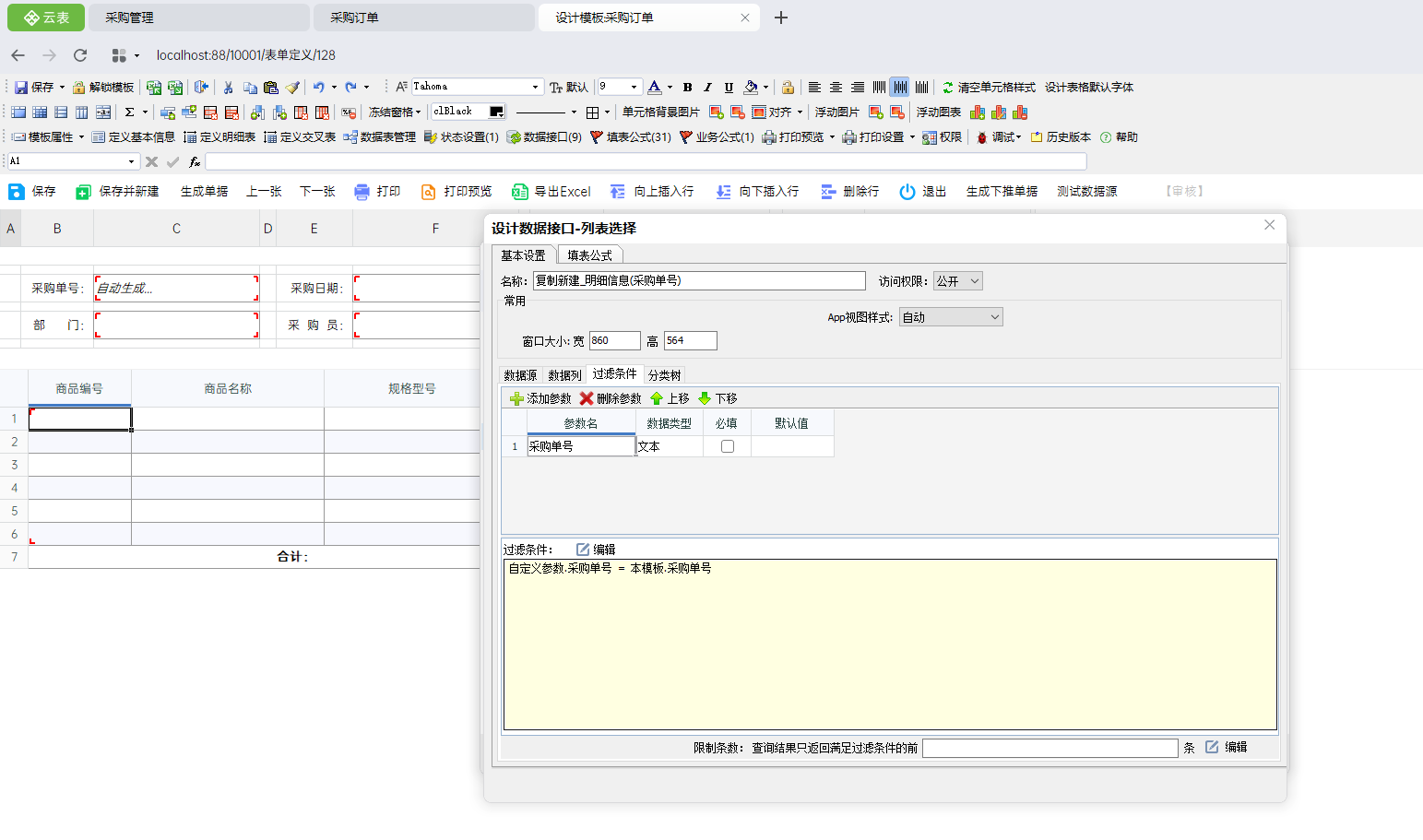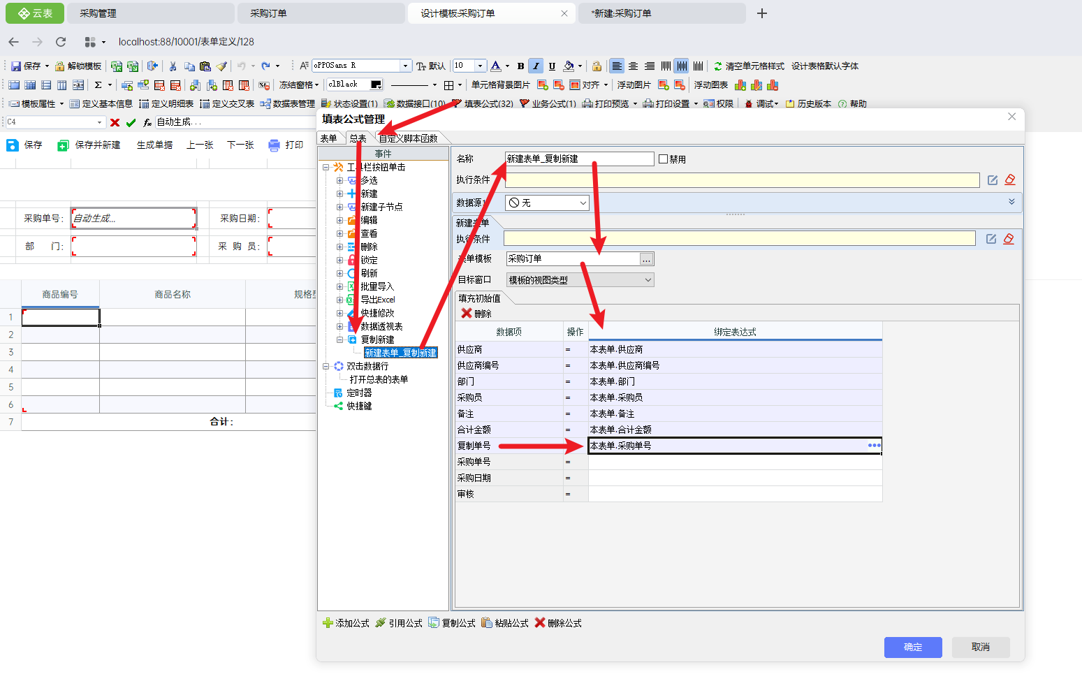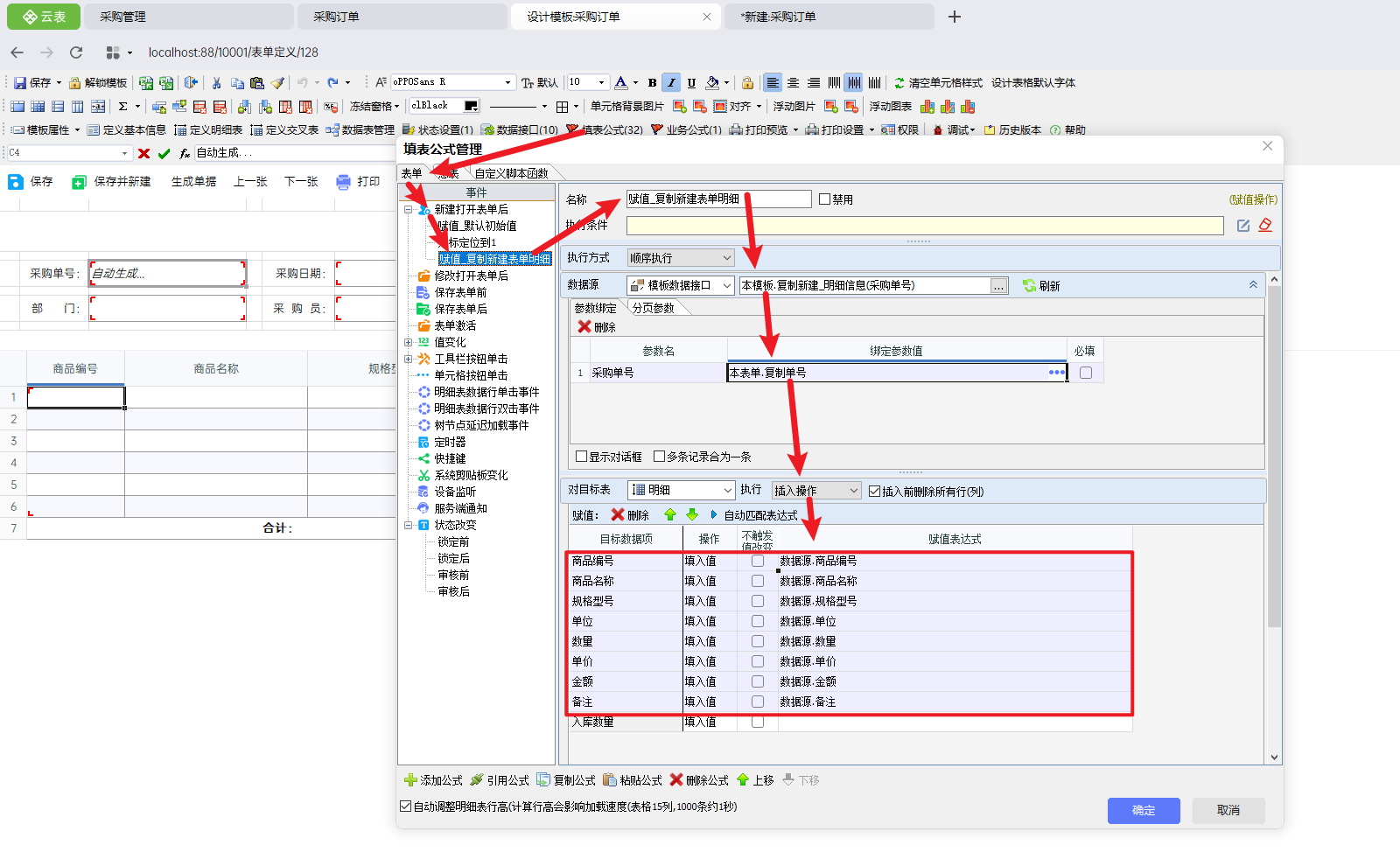 ②在设计明细公式时,绑定的参数应为复制单号,而不是采购单号