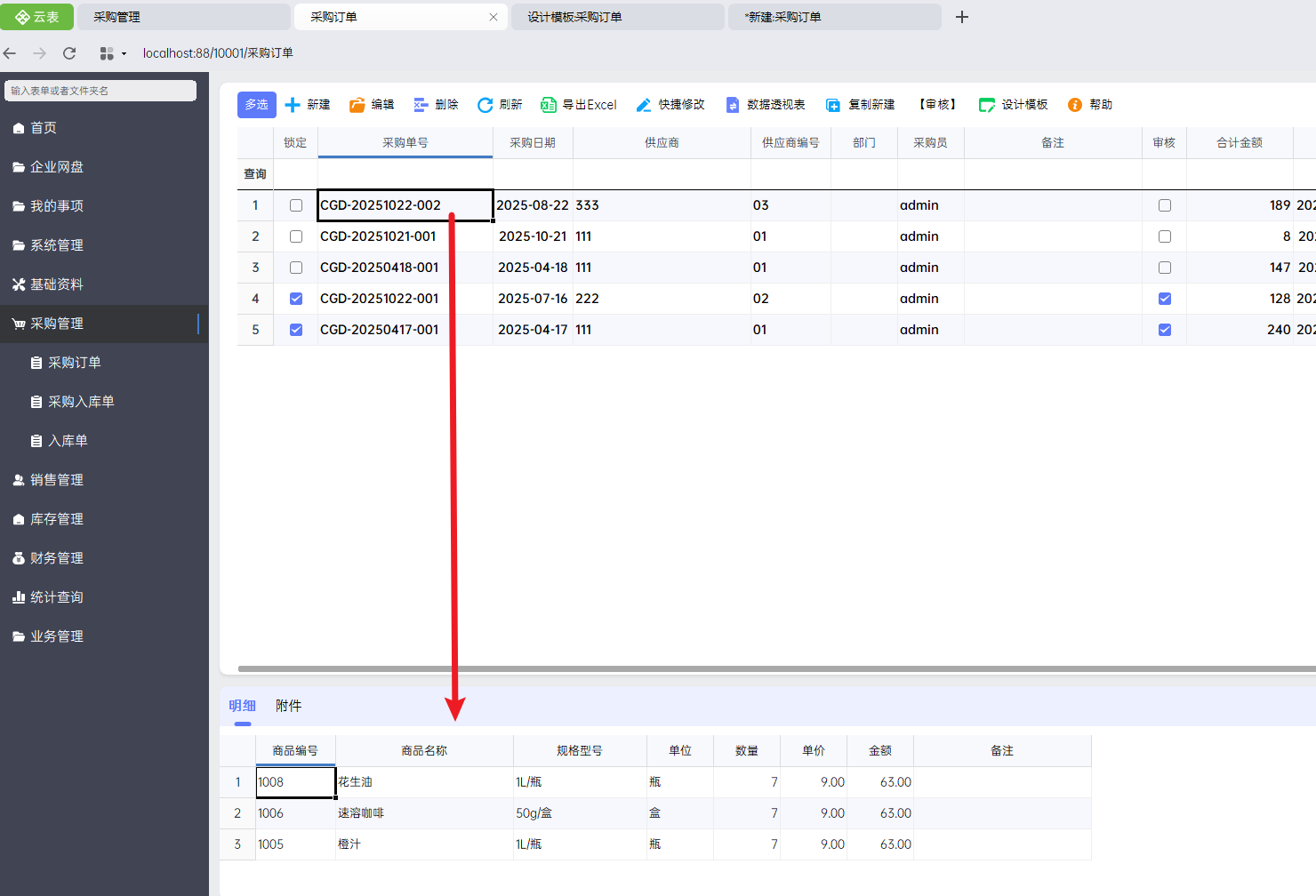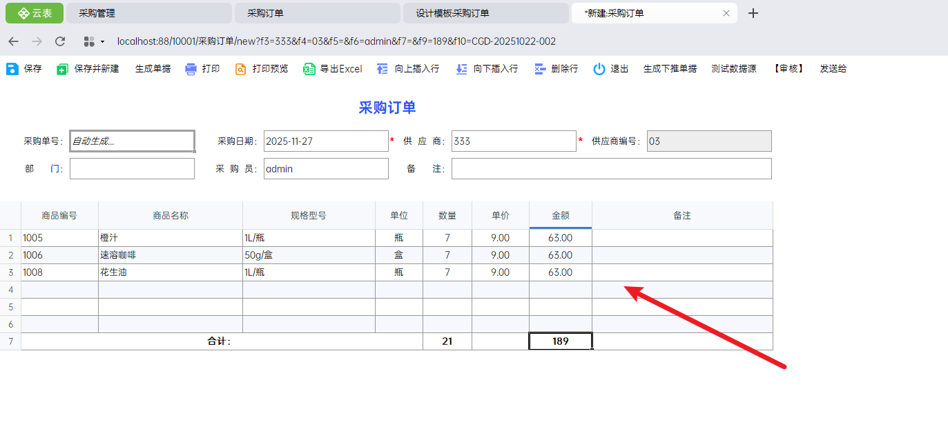 注意:这里的采购单号为复制单号,也就是来源表单的单号