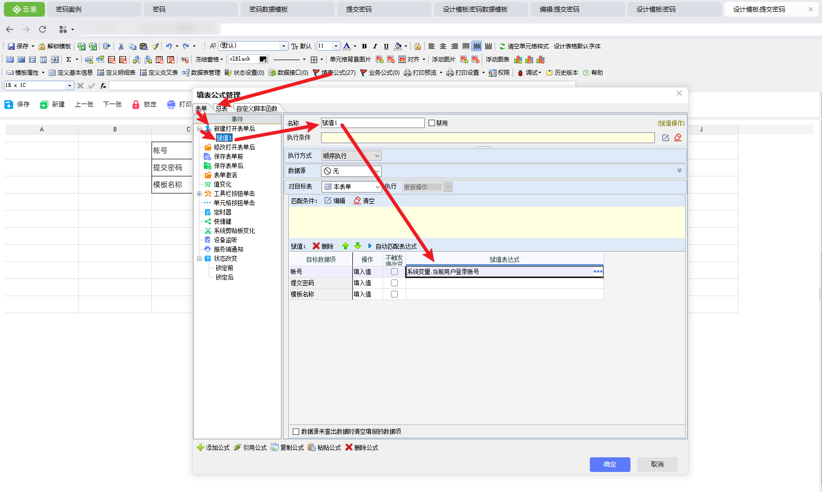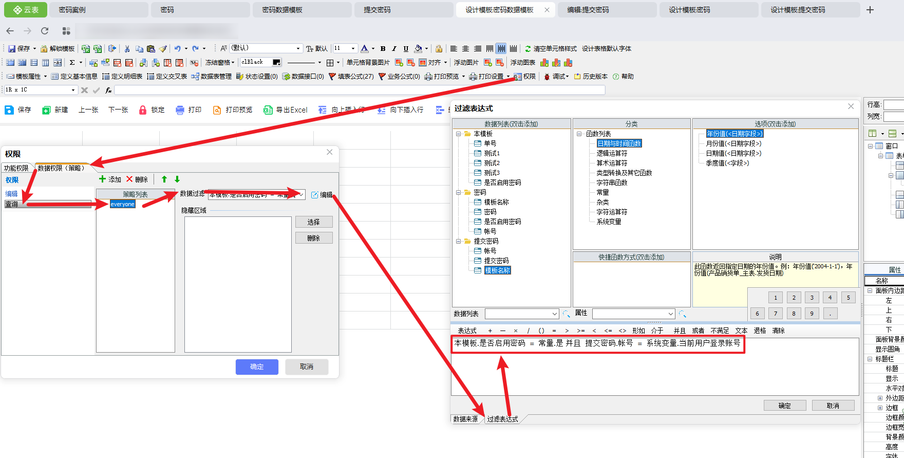 在表达式中设计条件,当表单需要启用密码,并且当前登录账号等于提交密码模板中的账号时