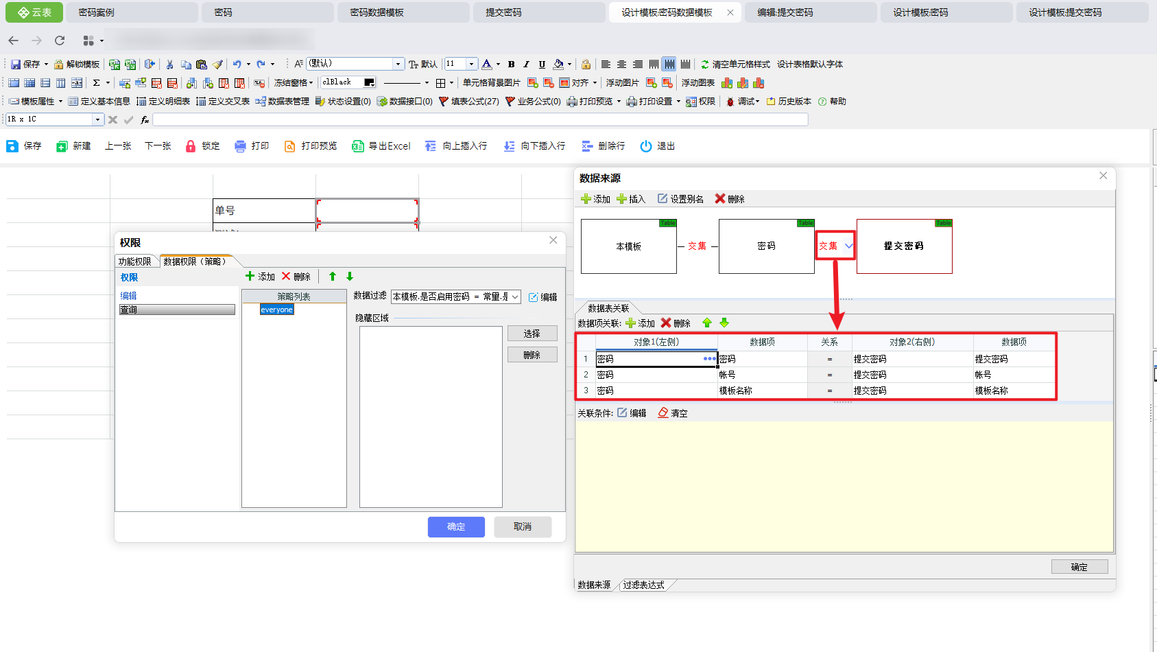 将【密码】与【提交密码】两个关联为交集,并设置关联关系