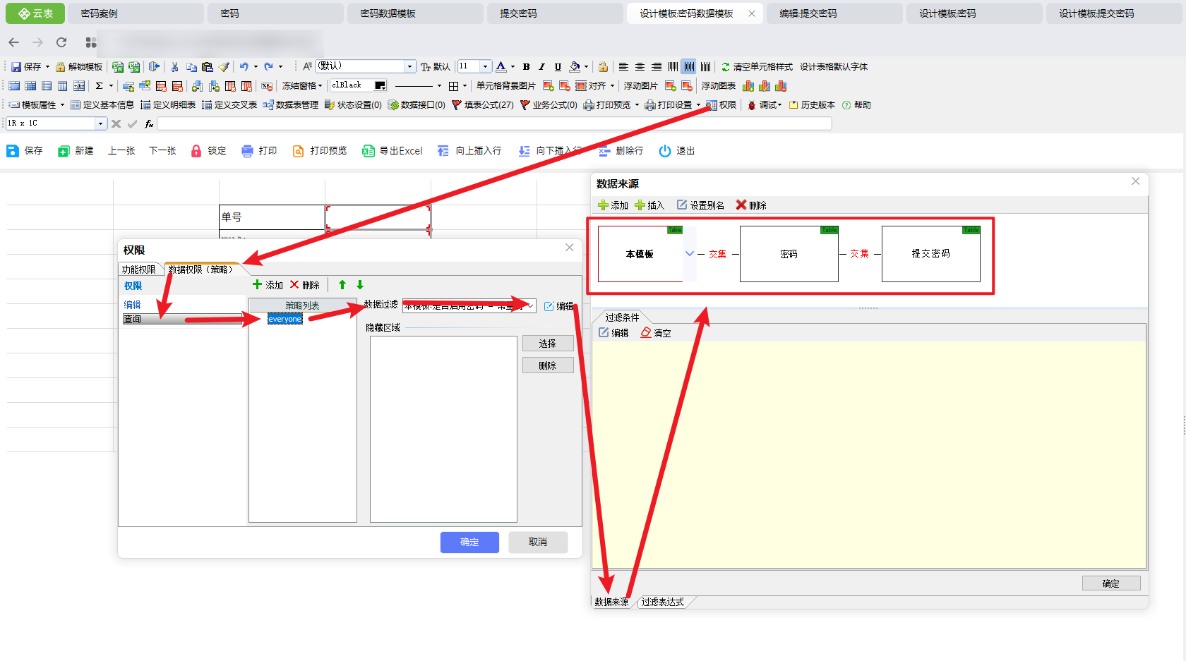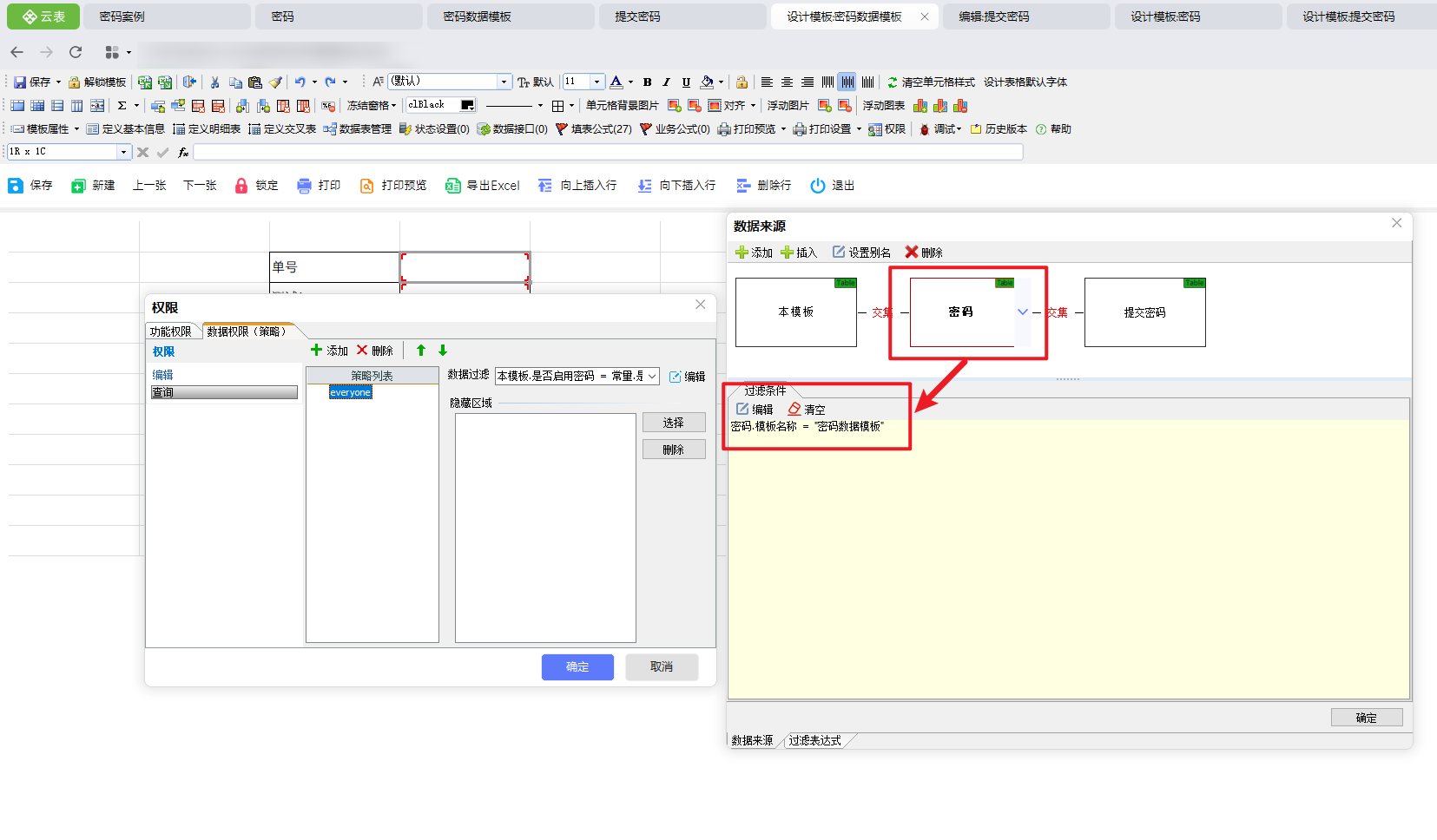 在数据源的【密码】模板下设计过滤条件,模板名称过滤为当前模板名称,若有多个模板需要二次验证查阅,可以使用同一个【密码】模板与【密码提交】模板