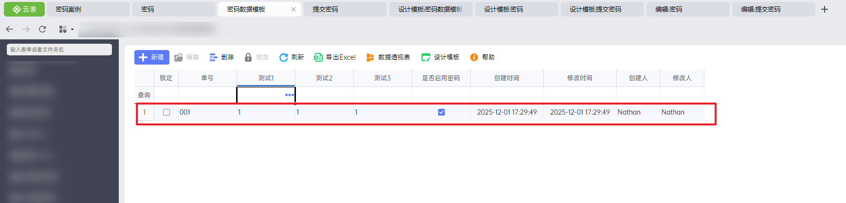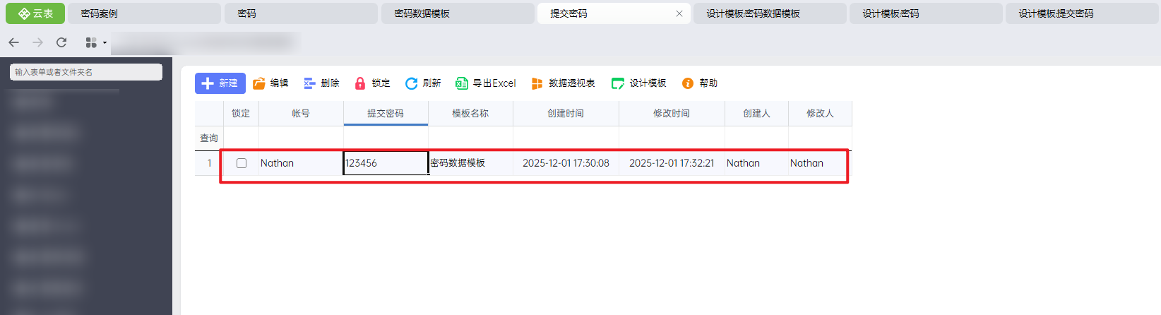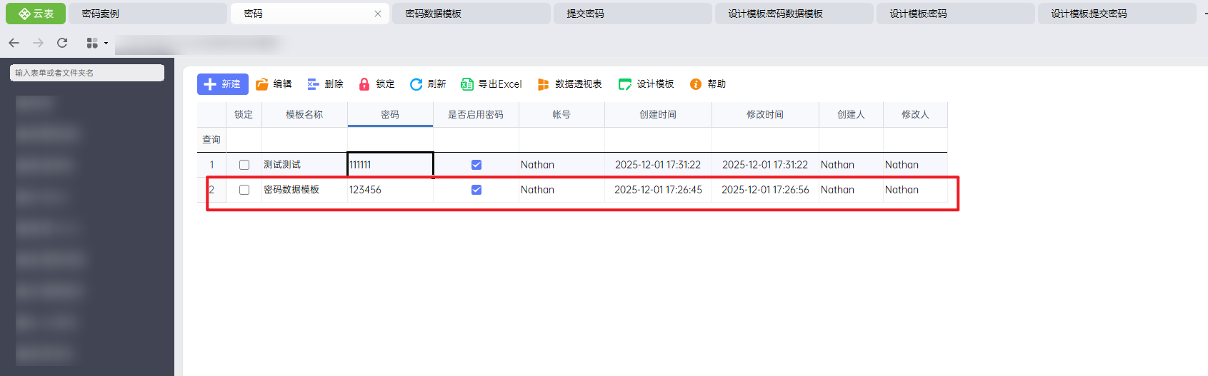 用户在【密码数据模板】模板中查看数据