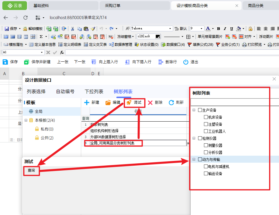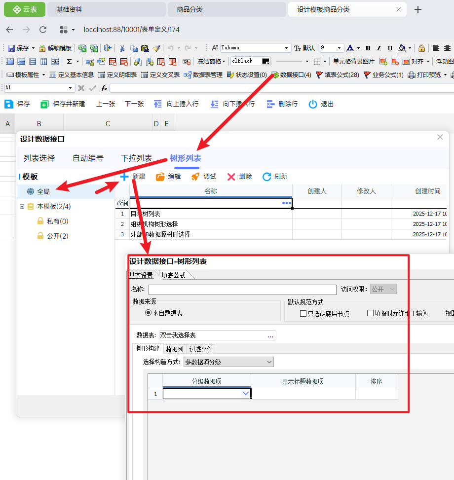 操作步骤:【数据接口】-【树形列表】-【全局】-【新建】-◇填写数据接口名称-◇选择数据表(商品分类)-◇构建树形(使用自我繁殖方式构建)