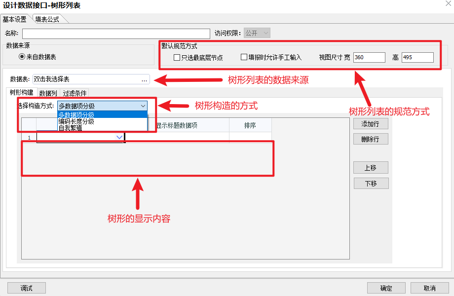 新建一个数据数据接口后,我们需要对这个数据接口填写相应的内容,下图为树形列表数据接口的内容说明
