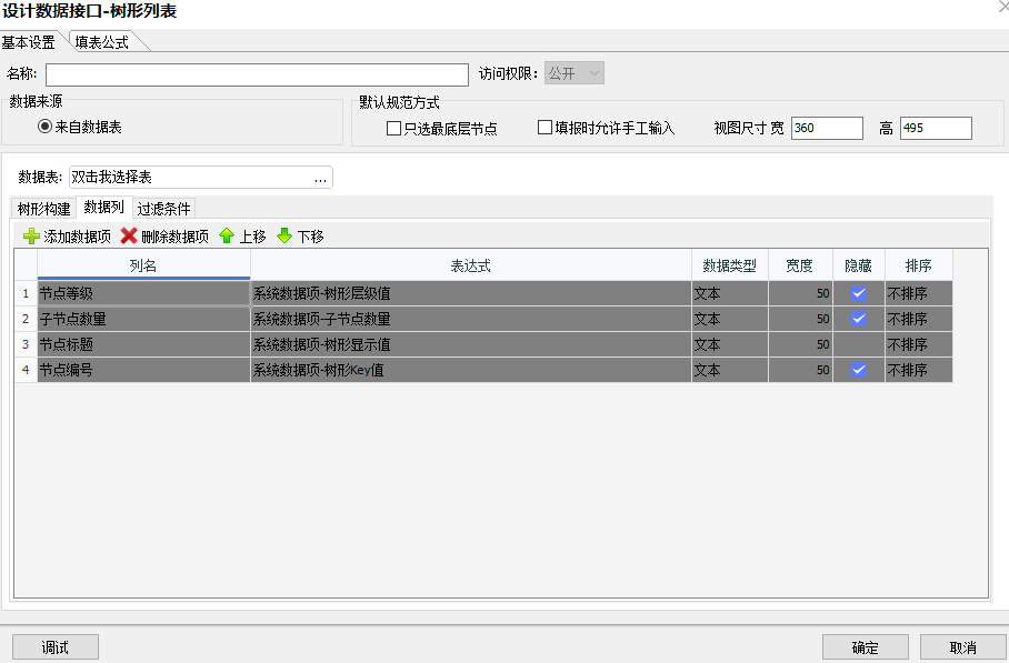 数据列:系统默认有四个数据列:节点等级、子节点数量、节点标题以及节点符号。属性列表数据接口的数据列为树形列表显示的内容
