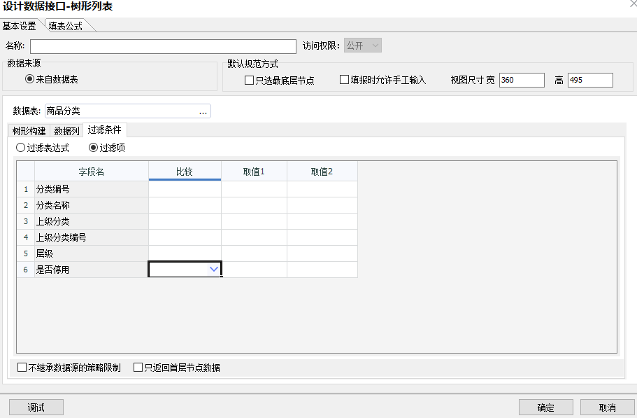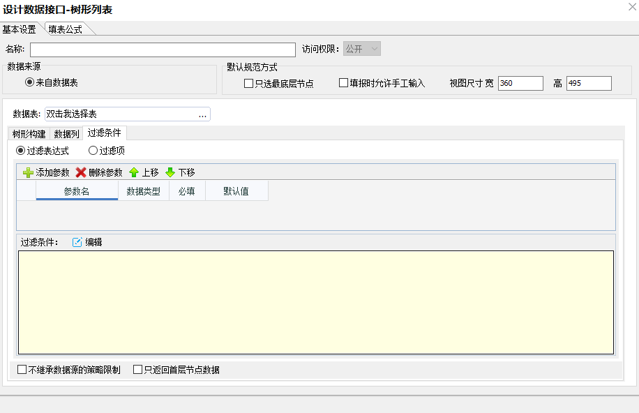 过滤条件:树形列表数据接口的过滤条件与其他类型接口的过滤条件使用方式相同,都是可以通过数据源的字段内容进行过滤,也可以通过添加参数变量的方式进行过滤