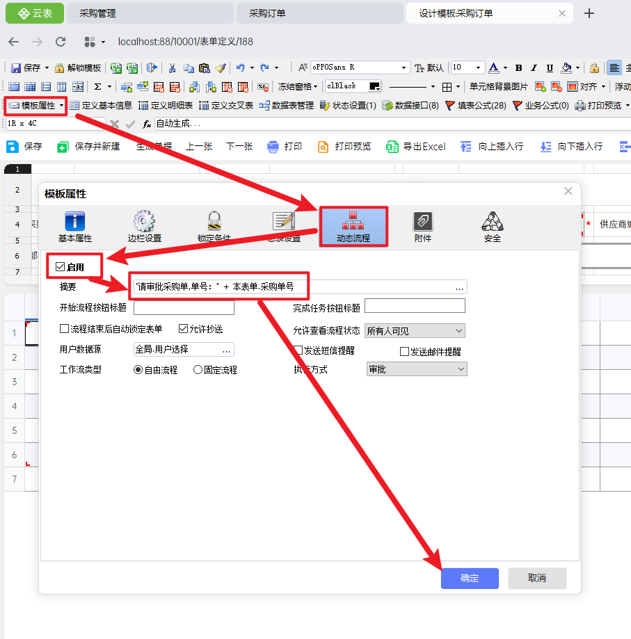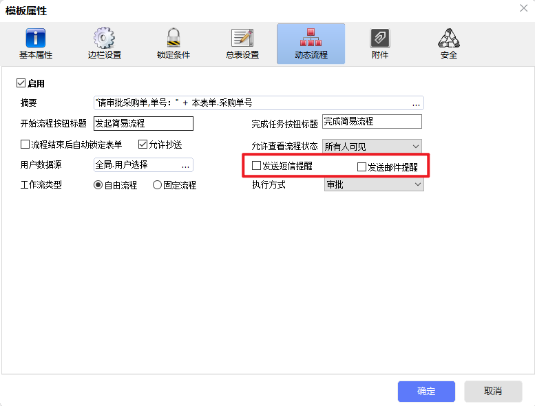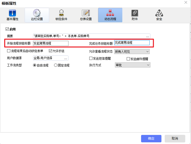 操作步骤:【模板属性】-【动态流程】-【启用】-◇填写“摘要”