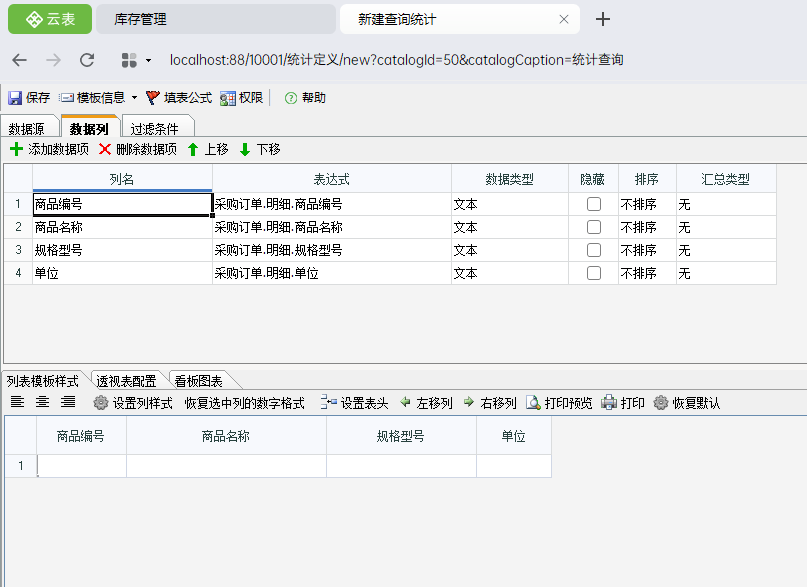 上两节讲解了如何设计一个最简单的查询表,查询出了所有的采购信息与采购明细信息,那么本节将以:查询出所有采购商品的种类为背景,讲述云表的小功能:重复数据只显示一次