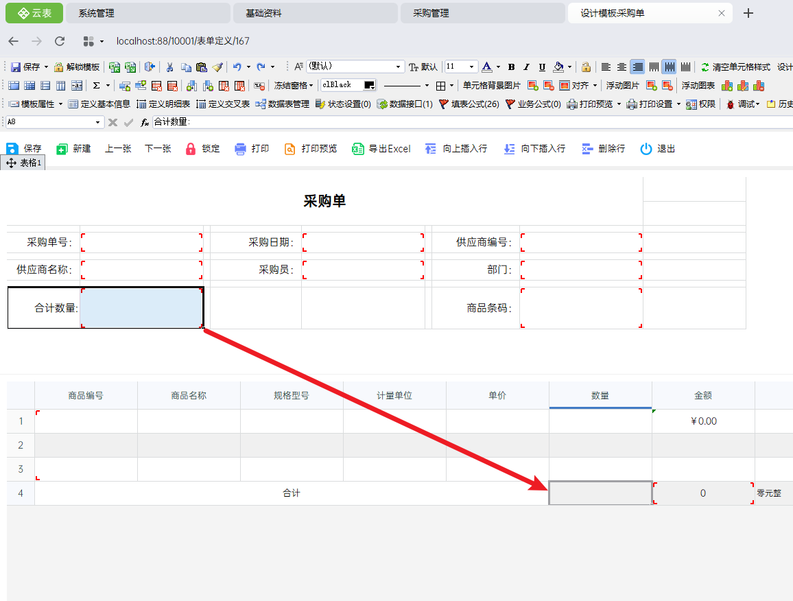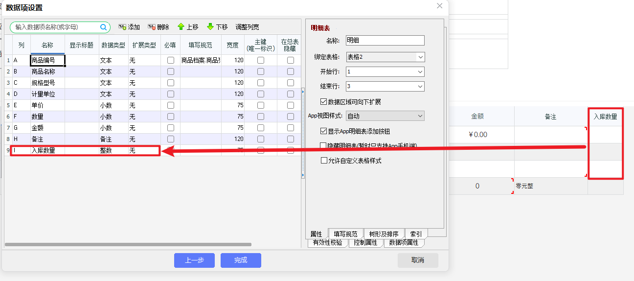 例如:现需要将【合计数量】数据项放置在另一个表格面板中,该如何修改数据项的位置呢?