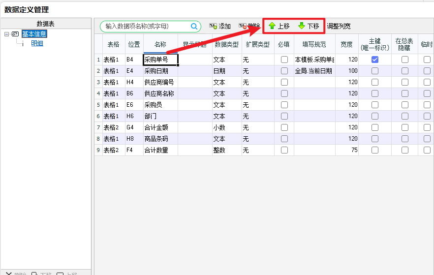 总表中默认的显示顺序,是根据数据表管理中的顺序进行排列的,通过数据表管理中的【上移】、【下移】按钮,可以修改数据表管理中的数据项顺序,总表中的顺序也就跟随之修改