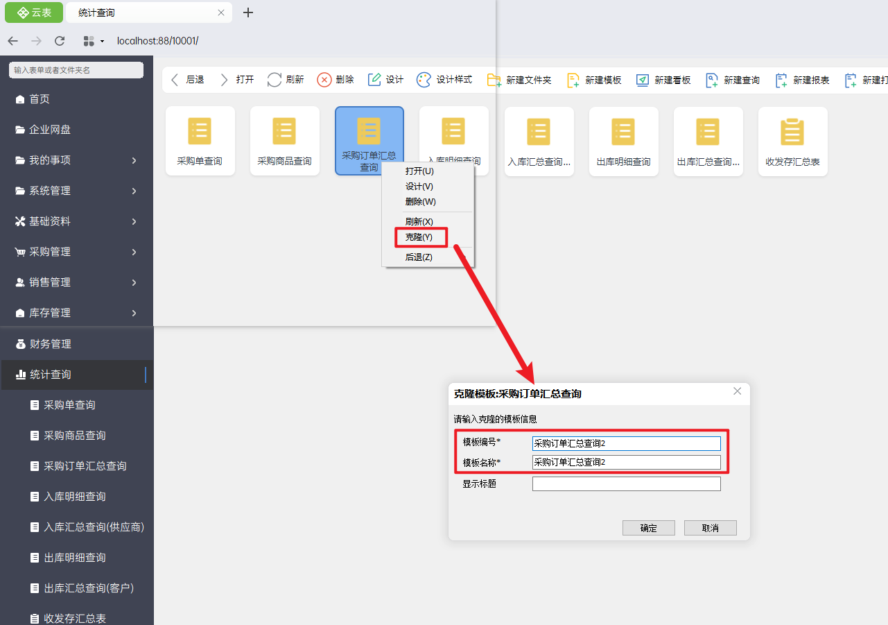 云表支持模板的克隆,在实现本教程的内容之前,可以先将之前设计好的《采购单汇总查询》模板克隆一遍,再进行设计