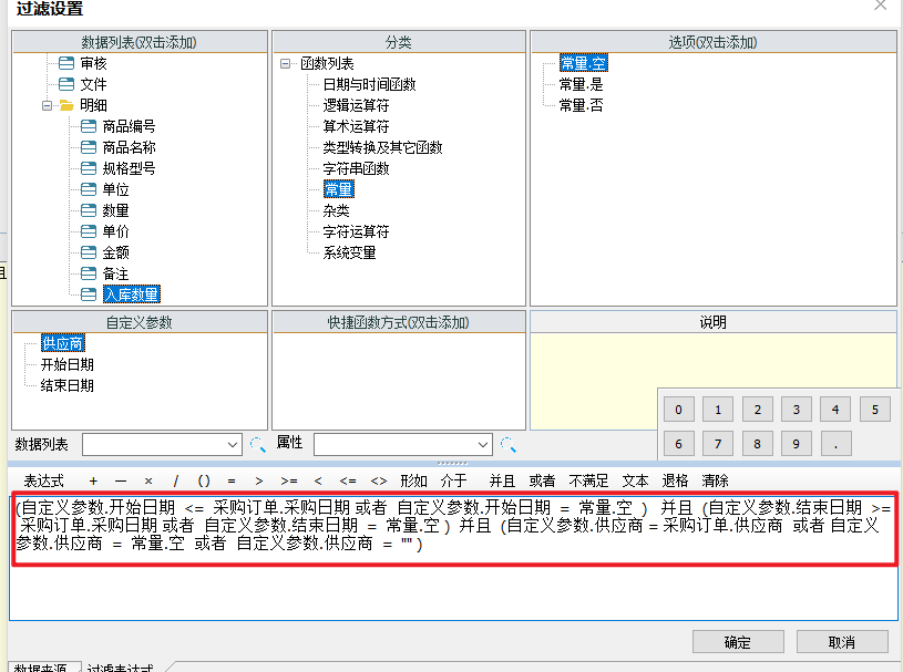 - 参数有值与参数无值,这两个条件是满足其一即可,则需要使用“或者”进行连接,也就是:自定义参数.供应商 = 采购订单.供应商 或者 自定义参数.供应商="" 或者 自定义参数.供应商=常量.空