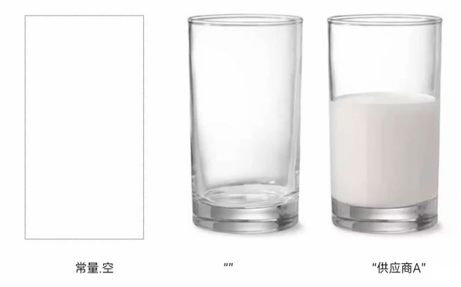 一个空杯子,杯子中什么都没有,但是杯子还在,这里可以对应为文本空"",也就是虽然里面没有内容,但是杯子还在,那么这是一组空字符串