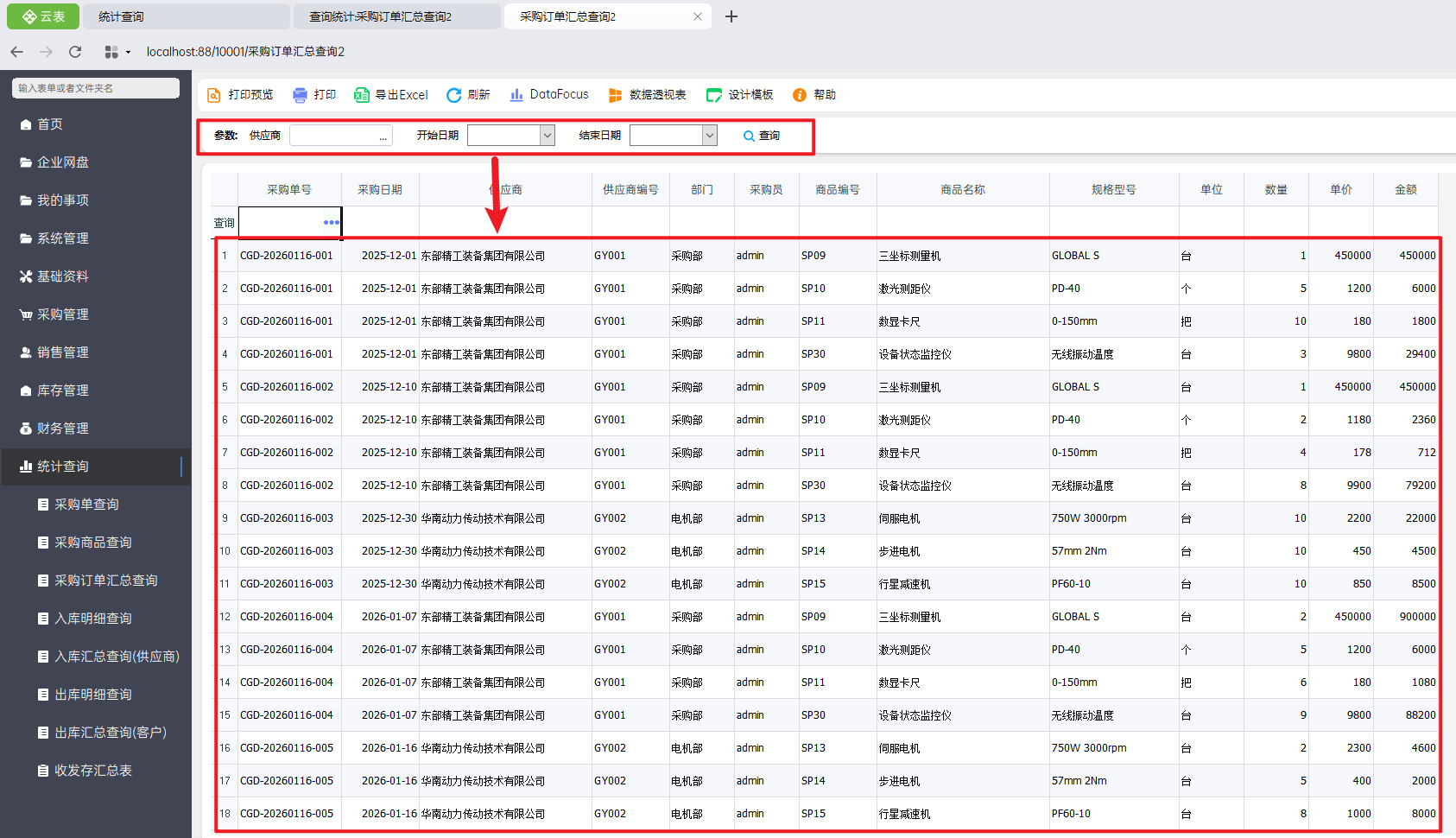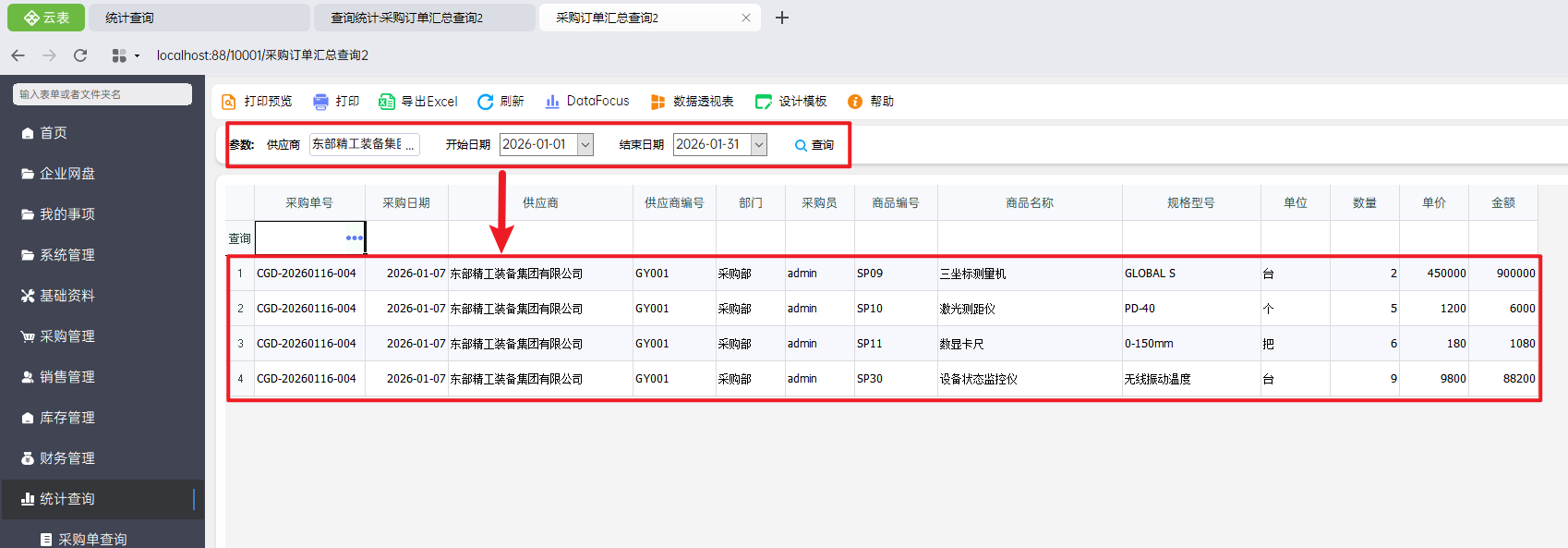 - 当多个参数一起查询时,则多个参数需要同时满足,则需要使用“并且”进行连接,也就是:自定义参数.开始日期<=采购订单.采购日期 并且 自定义参数.结束日期>=采购订单.采购日期