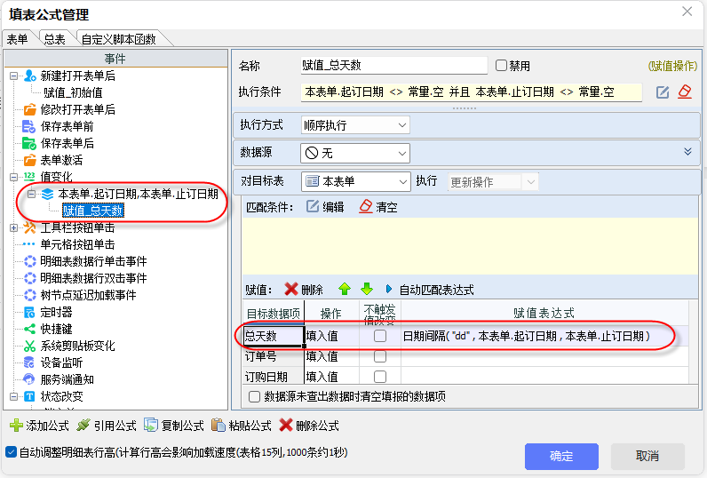 计算总天数。更改起订日期或者止订日期时,重新计算总天数。