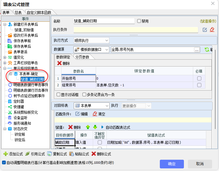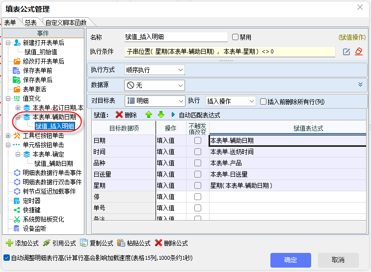 3)条件判断与插入。“辅助日期”赋值后触发它的值变化事件。在此事件的执行条件中,系统通过