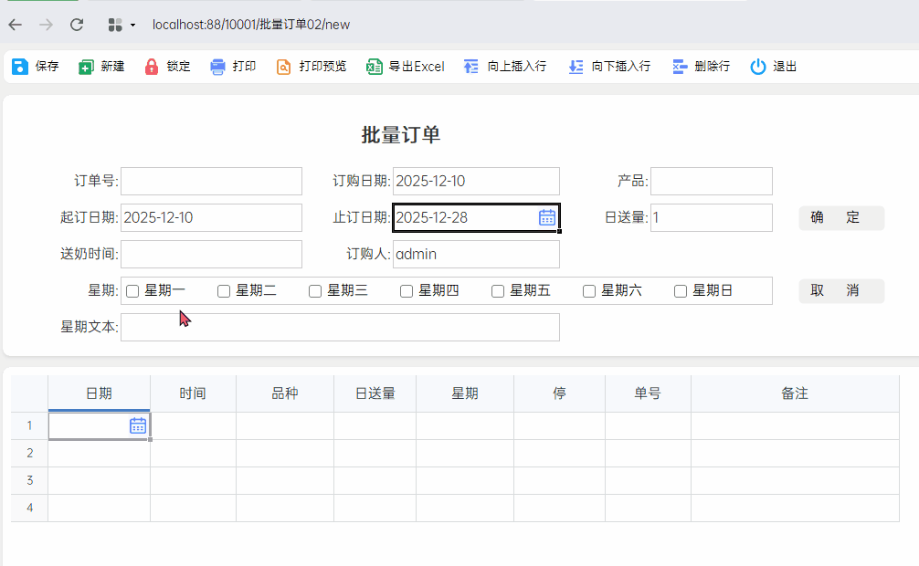 新建表单后,系统已预先填写了起止日期。当用户多选星期后单击【确定】,系统便会自动将符合条件的日期插入到明细中。