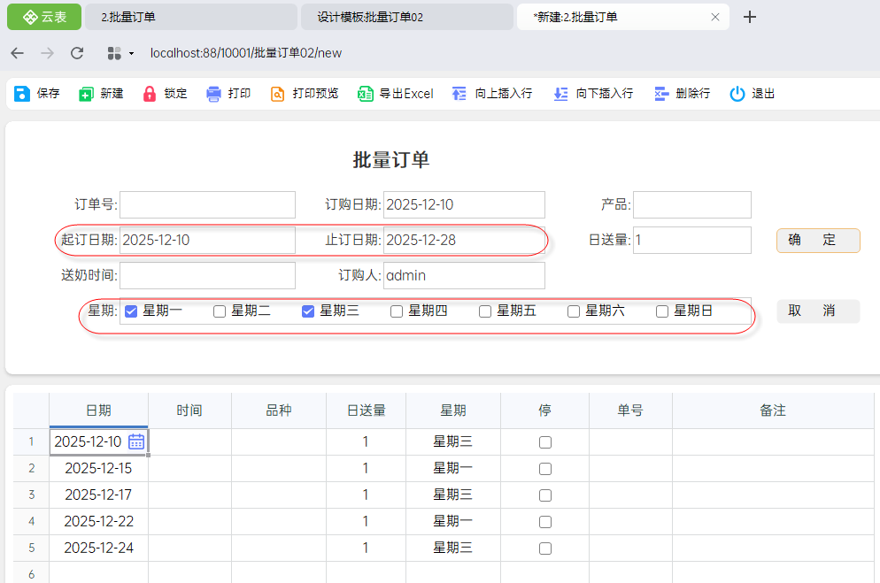 在设计开发中,为实现某个功能,我们通常需要创建循环,再配合相应的操作来实现。为了让大家掌握循环的分析与设计方法,我们以“批量生成明细数据”为例:通过设定起止日期,系统将自动生成符合指定星期条件的日期列表(如下图所示)。