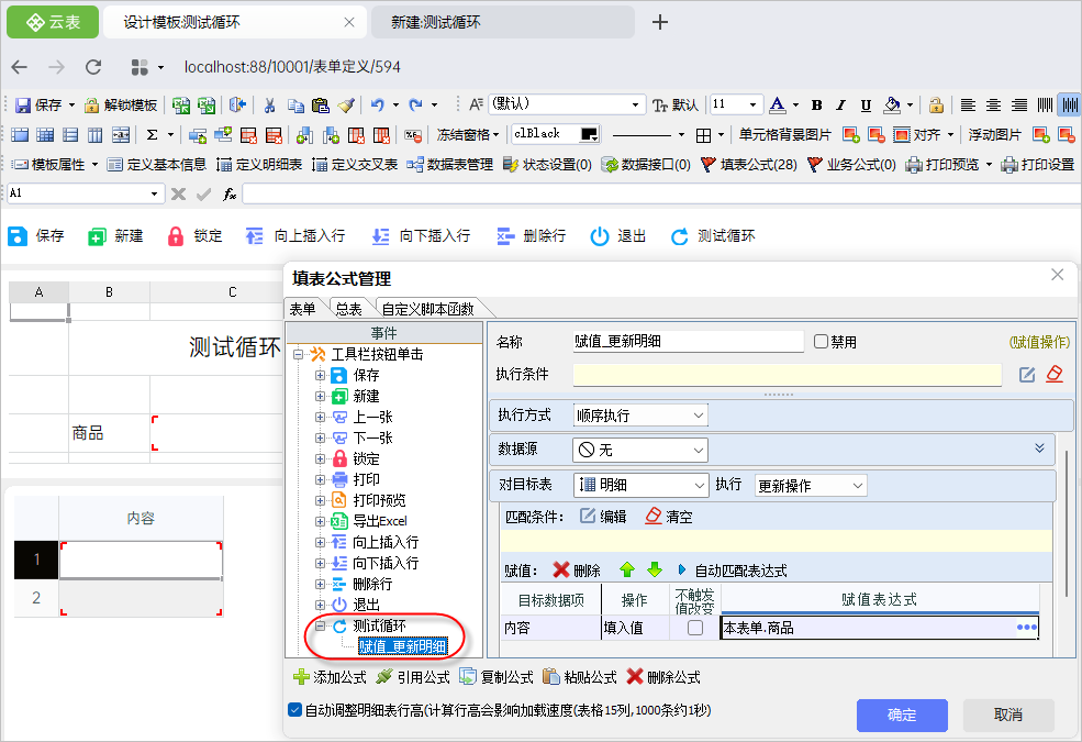 目标表明细的循环作为第一层循环执行 ,序号列表的循环作为第二层循环执行,第二层循环嵌套在第一层循环中,通过事件触发实现了循环的嵌套!