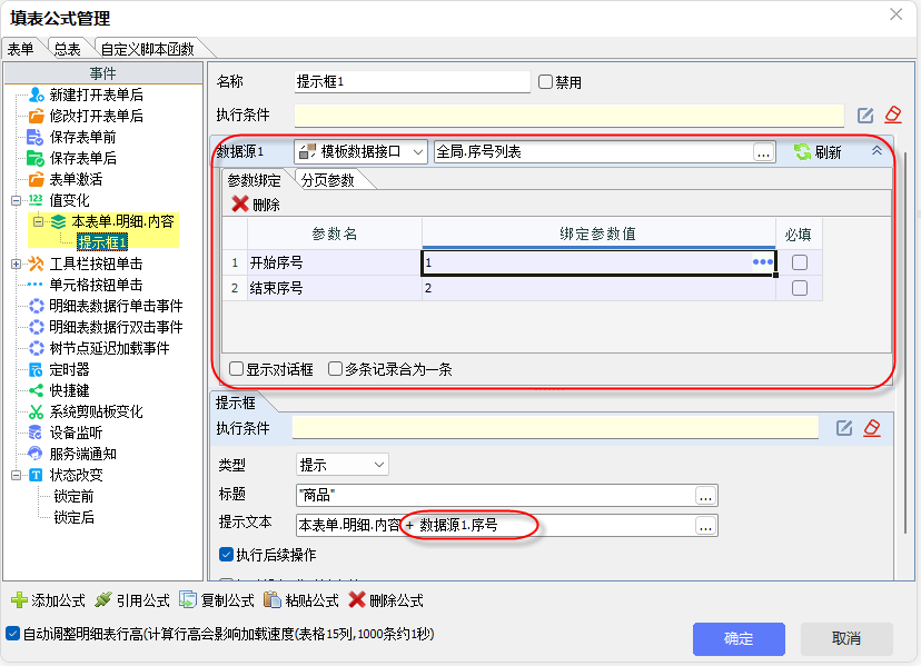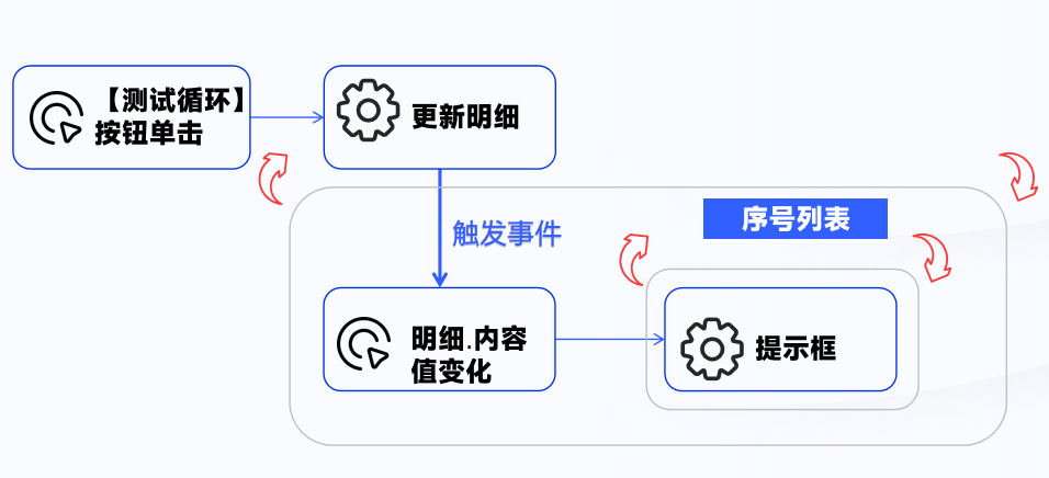 明细.内容的值变化事件下,已有提示框的操作,每当明细.内容更新时,触发明细.内容的值变化,从而触发该事件执行弹出提示框操作。 为了测试嵌套循环:在提示框操作中,将数据源设置为序号列表,开始序号为1,结束序号为2,并在提示文本中添加序号,作为不同提示框的标识。