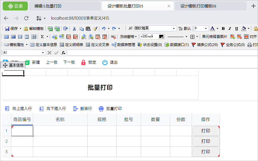 1)为了让打印更灵活,通常我们会把业务执行模板和打印样式模板分开设计,做成两个不同的模板:“批量打印05”和“打印模板06”