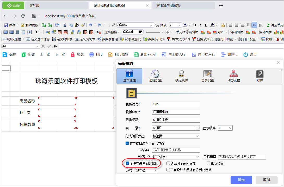 2)打印模板,打印的表单样式,不需要保存数据,勾选“不保存表单到数据库”。