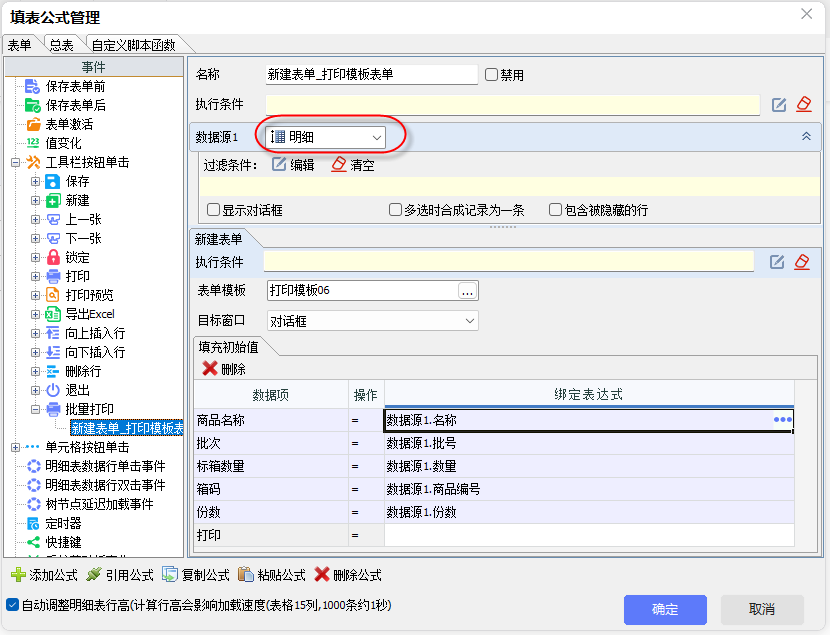 - 为了使每个商品都能按照打印模板打印,将数据源设置为 “明细”,系统将自动循环获取明细的每条记录,明细中有多少条记录,就会新建多少张打印表单,这是第一层循环。
