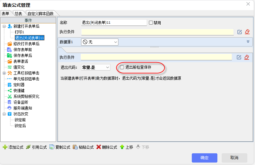 4)打印后自动关闭表单。为实现打印后自动退出,再引用 “退出(关闭)表单” 公式,并取消“退出前检查保存” 选项。配置后,表单将在打印完成时直接关闭,无需人工确认。
