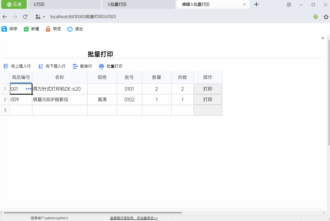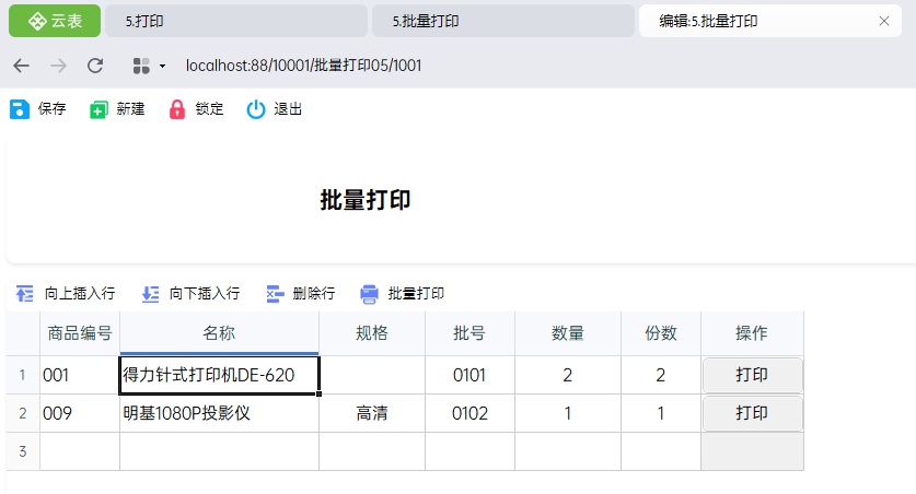 在商品标签打印时,经常会遇到一次需要打印多个不同商品的多张标签,如下图,单击【批量打印】时,需要将明细的所有记录,按照打印模板样式根据打印份数进行打印,比如,编号为“001”的商品要打印2次,编号为“009”的商品要打印1次。该如何实现呢?